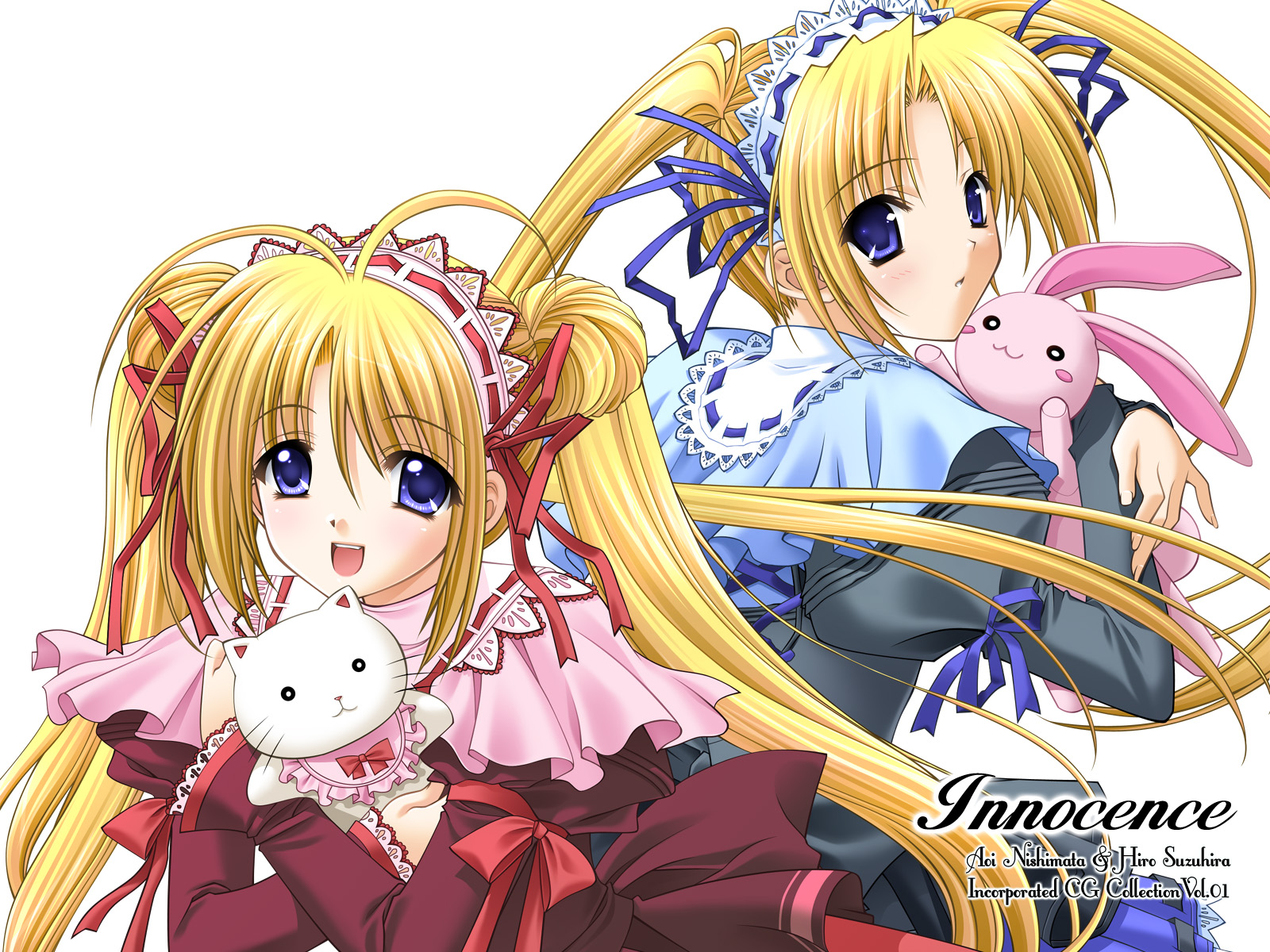 Description: Two anime girls with long blonde hair and blue eyes holding a rabbit in their arms and a pink bunny in her hand.