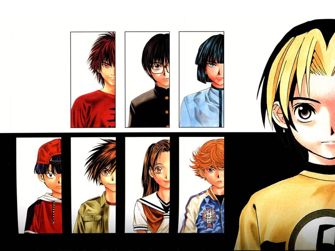Description: A group of anime characters with different hair colors and hairstyles.