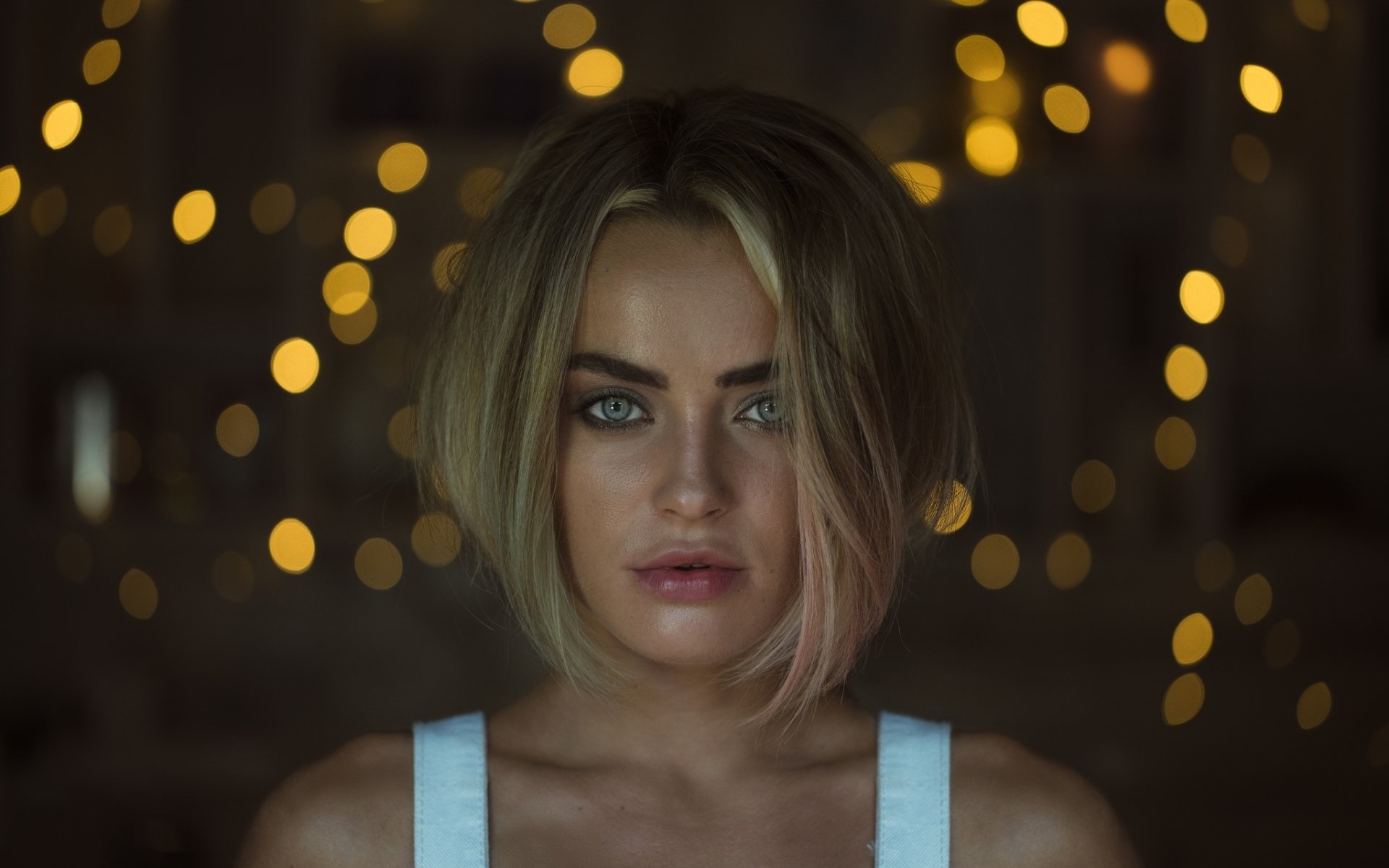 Description: A woman with blonde hair and blue eyes looking at the camera with a blurry background of lights behind her.