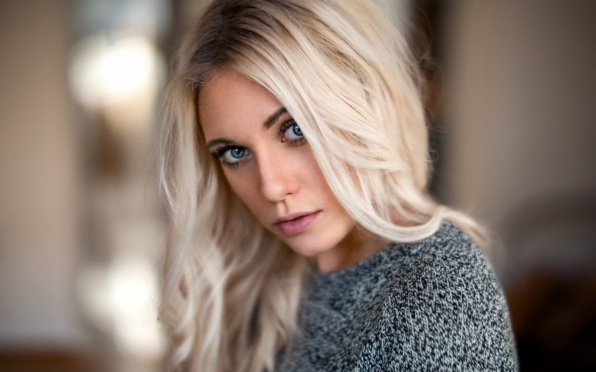 Description: A woman with blonde hair and blue eyes looking at the camera with a serious look on her face and shoulder.