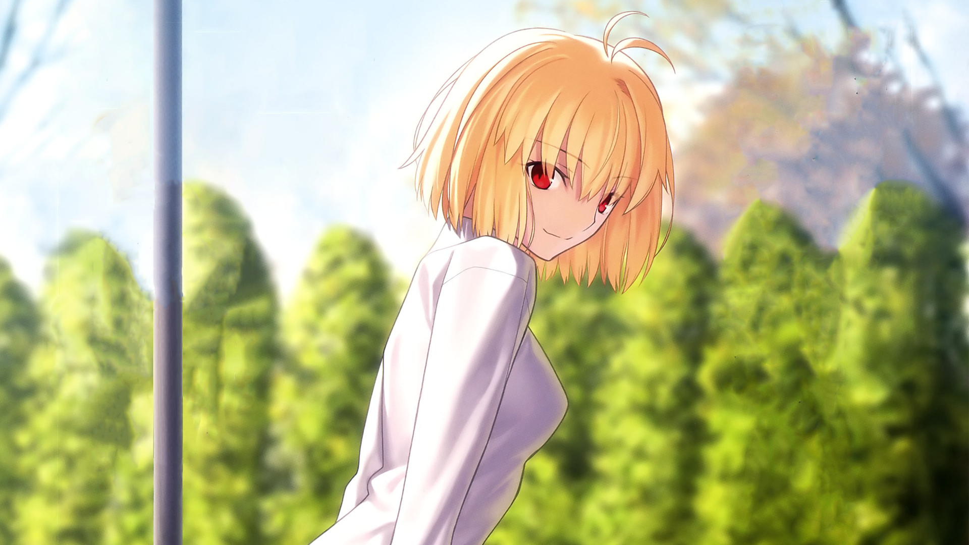 Description: A blonde haired woman standing in front of a forest with trees in the background and a pole in the foreground.