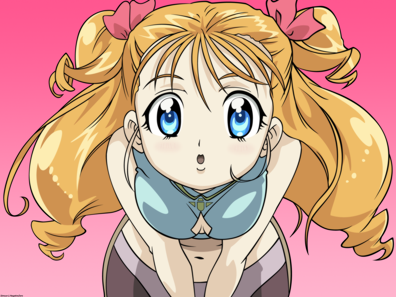 Description: A cartoon girl with blonde hair and blue eyes is posing for a picture with her hands on her head.