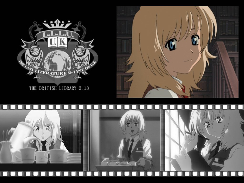 Description: A girl with blonde hair and blue eyes in a movie strip with a black background and a white background.