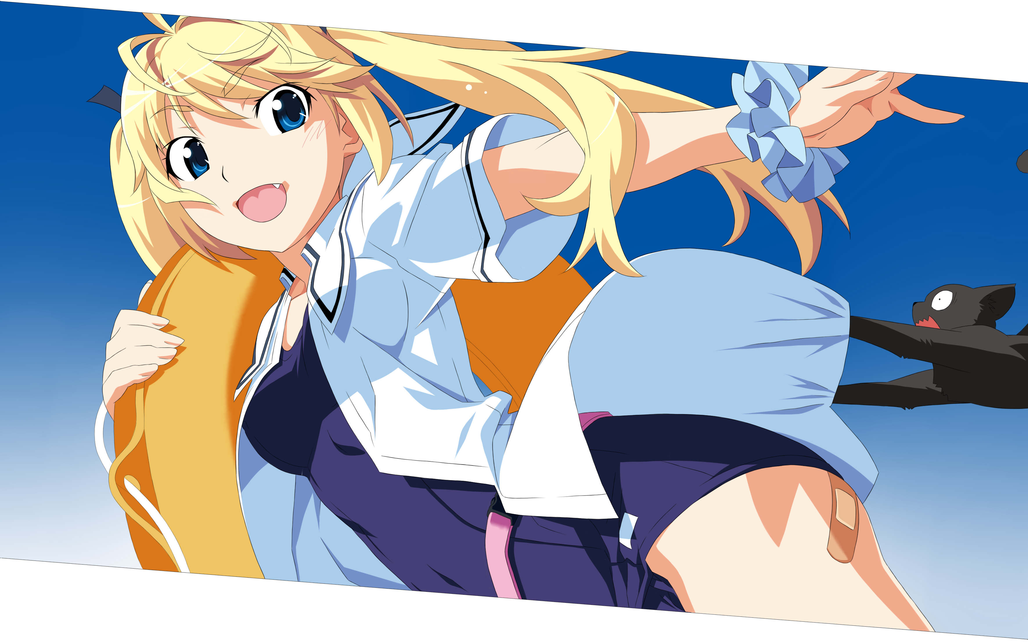 Description: A girl with blonde hair and a blue shirt is holding a black cat and a yellow scarf is flying in the air.