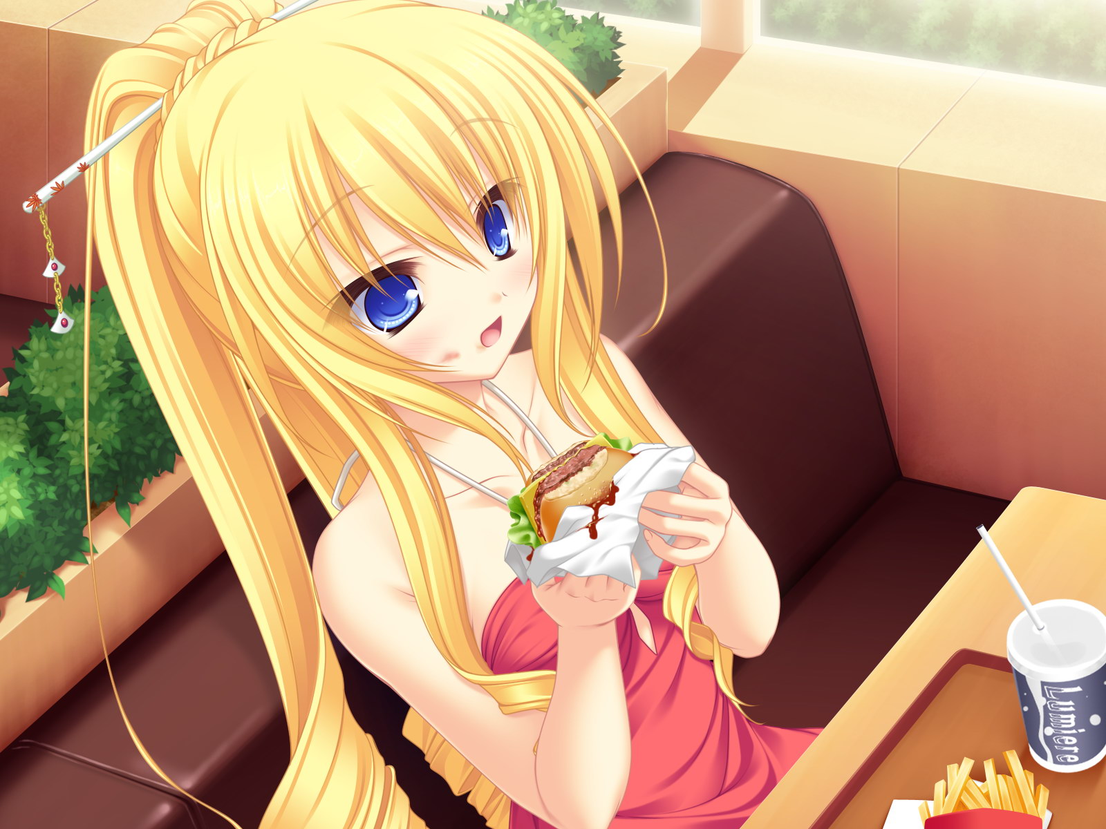 Description: A blonde haired girl eating a sandwich in a restaurant with a drink and a cup of coffee on the table.