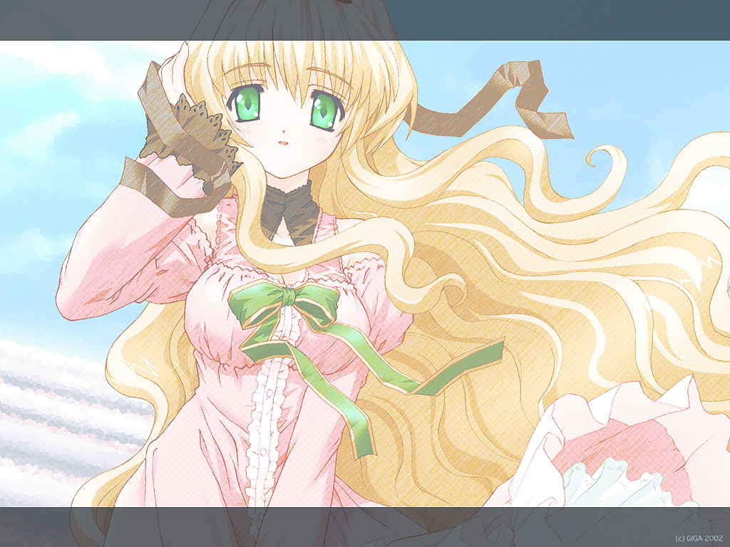 Description: A girl with long blonde hair holding a gun in her hand and a green eye patch on her forehead.
