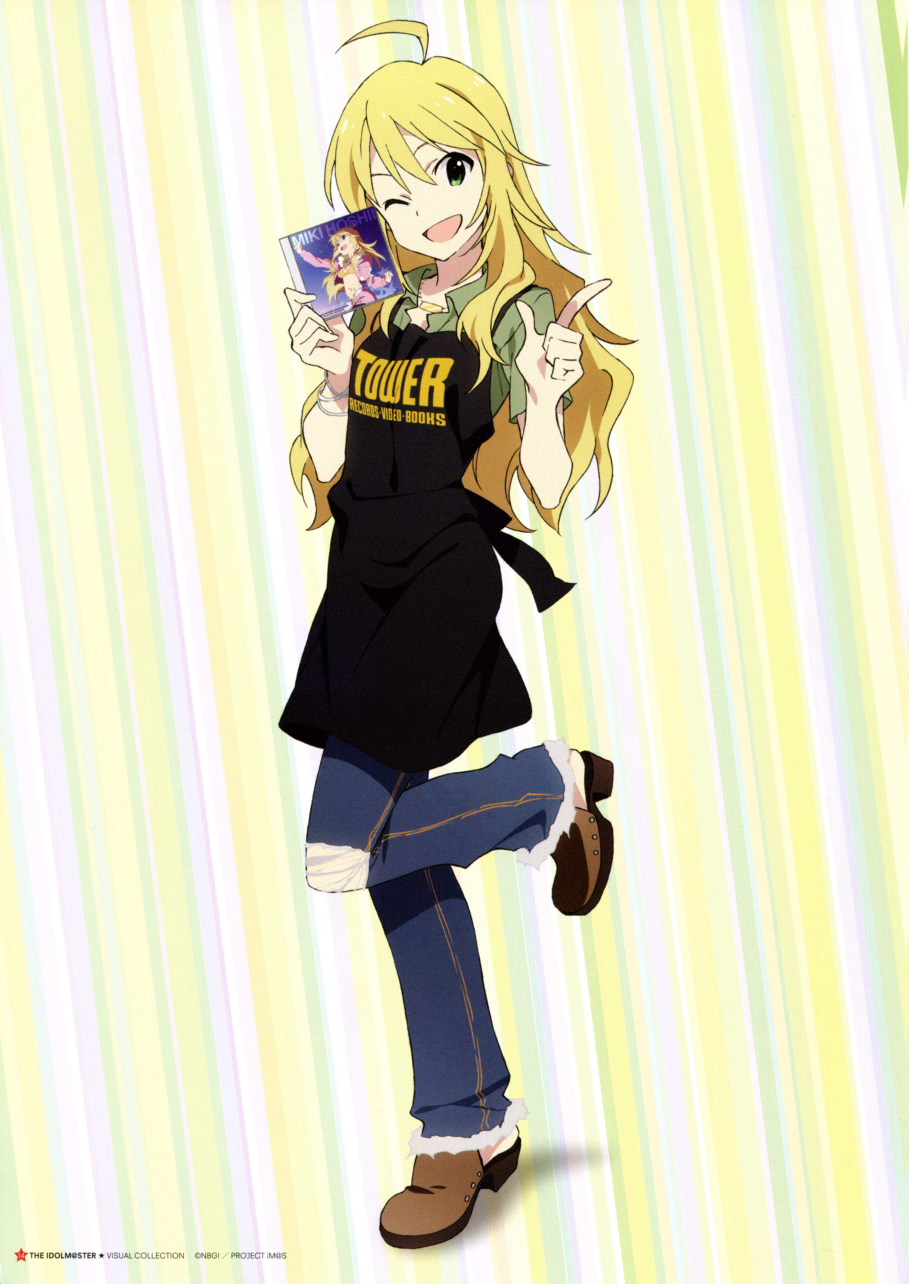 Description: A girl with blonde hair and a black shirt and jeans is holding a purple object in her hand and a yellow striped background.