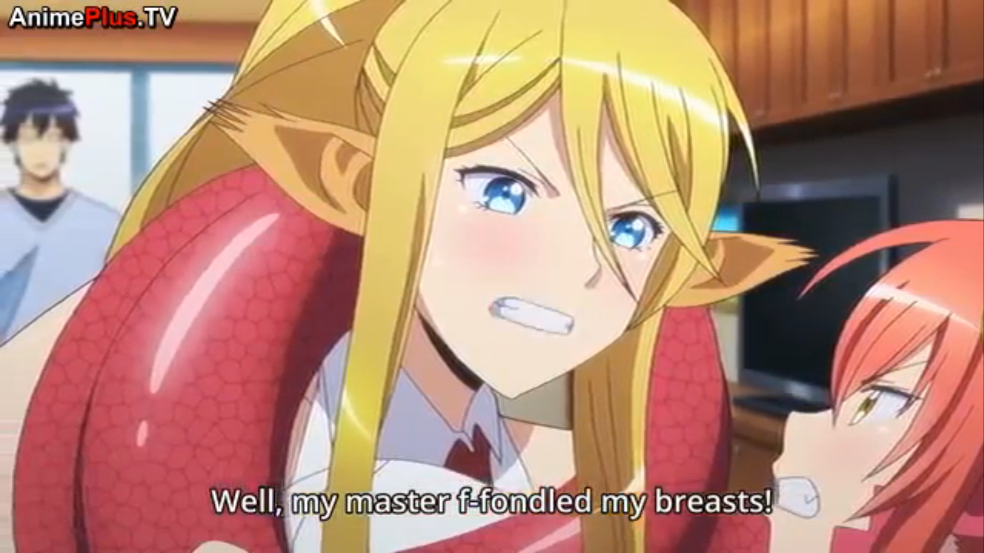 Description: A girl with blonde hair and a red dress with a sword in her hand and a man in a blue shirt behind her.