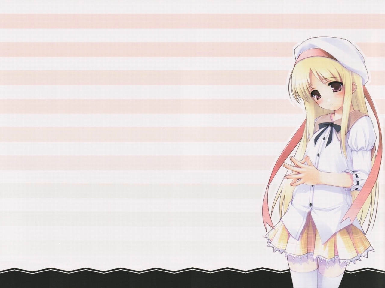 Description: A girl with long blonde hair and a sailor outfit standing in front of a striped background with a sailor's knot.