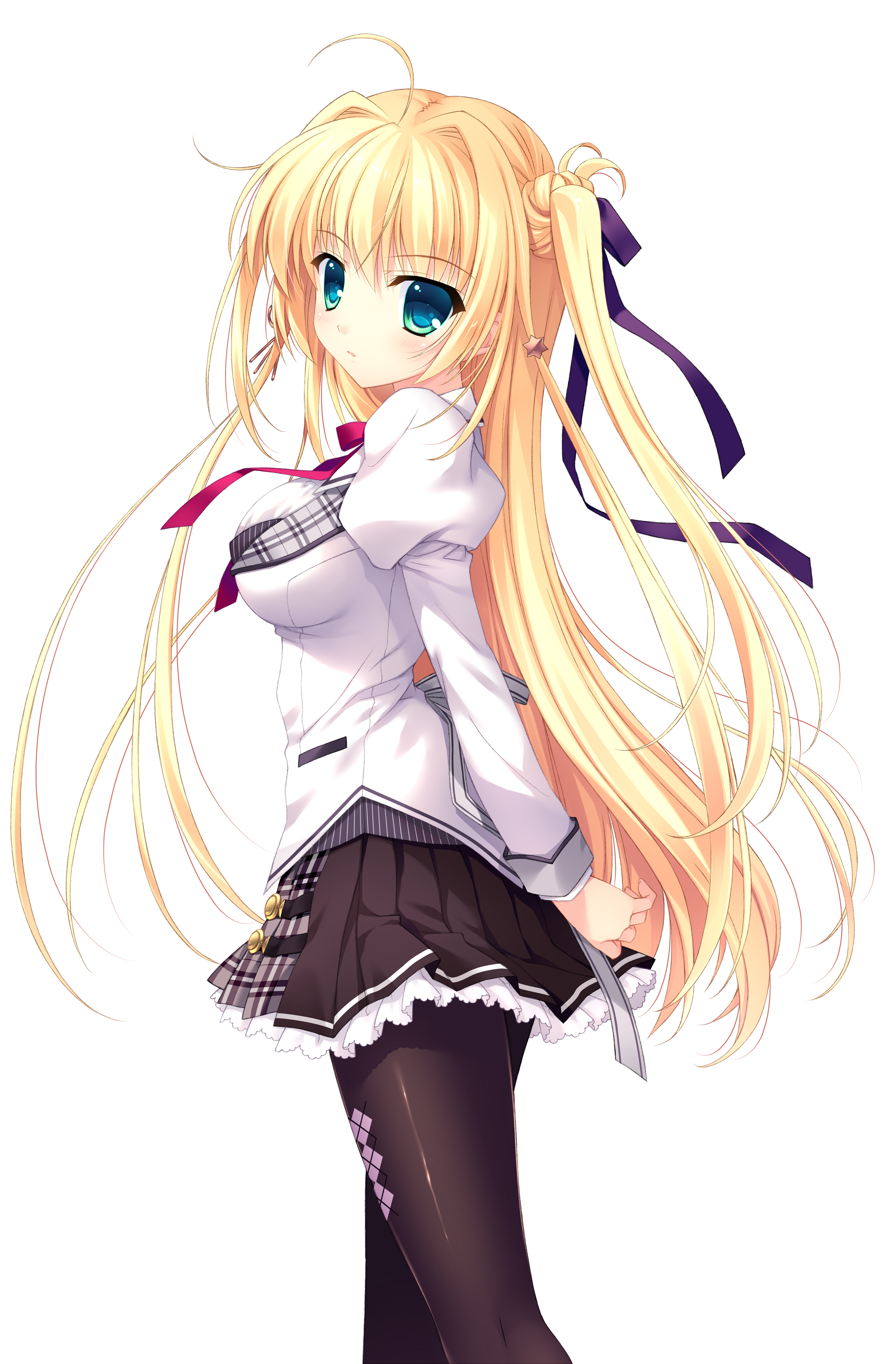 Description: A girl with long blonde hair and a white shirt and black skirt is standing with her hands on her hips.