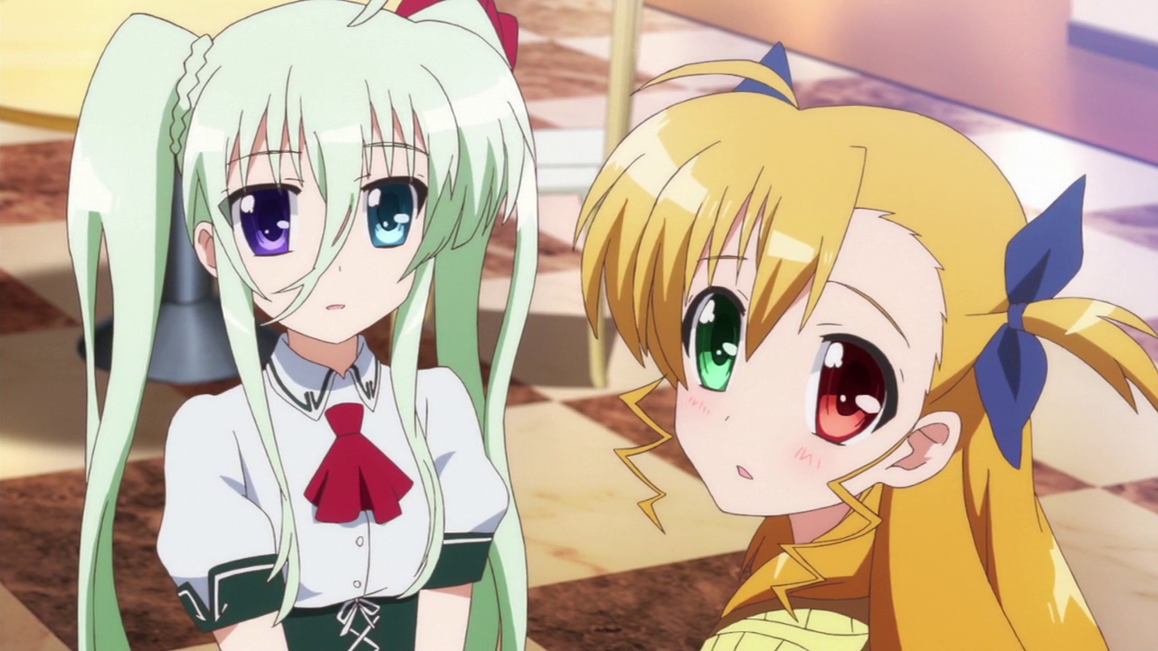 Description: Two anime girls with long blonde hair and green eyes looking at each other in a room with checkered flooring.