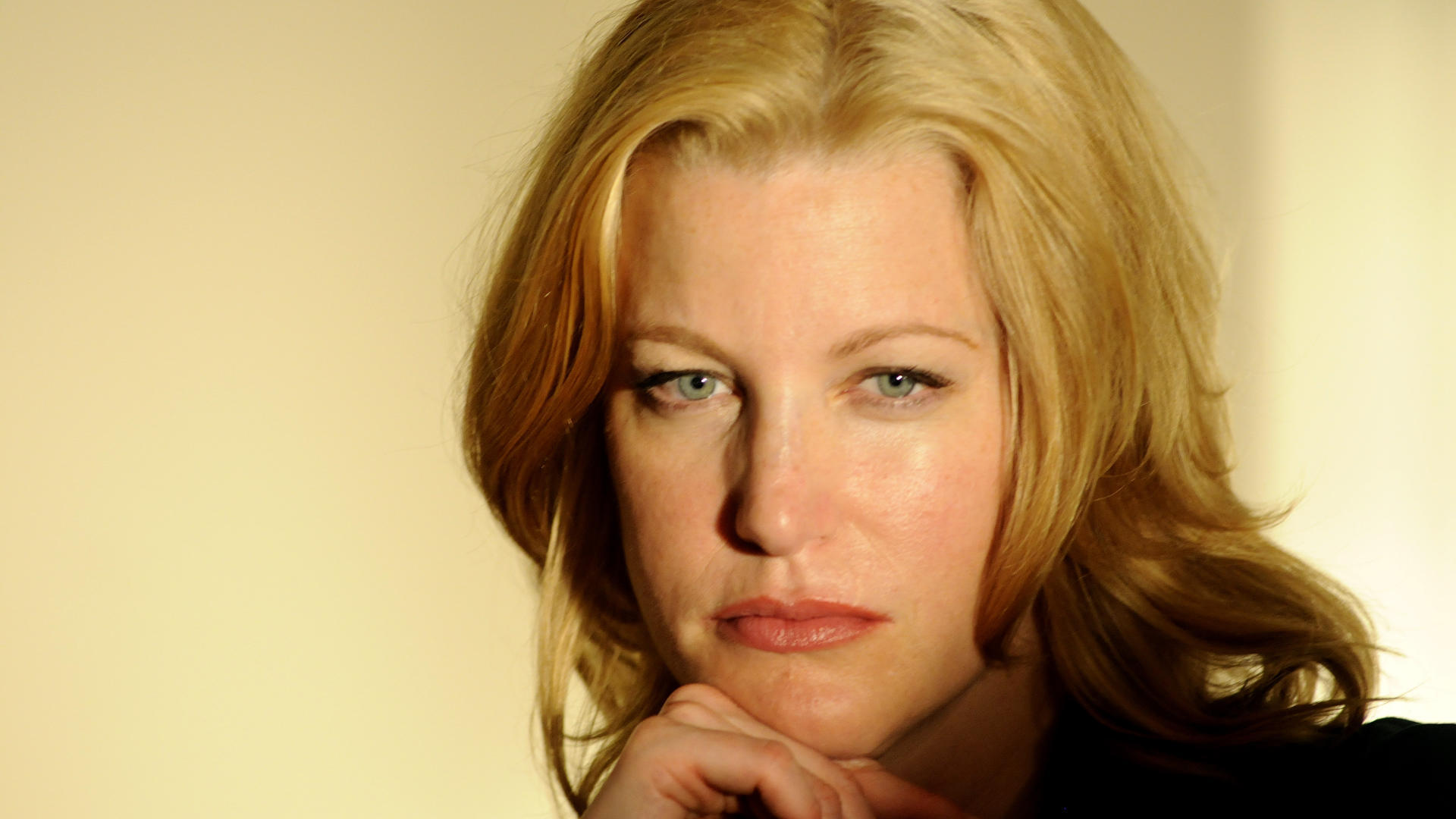 Description: A woman with blonde hair and blue eyes posing for a picture with her hand on her chin and looking at the camera.
