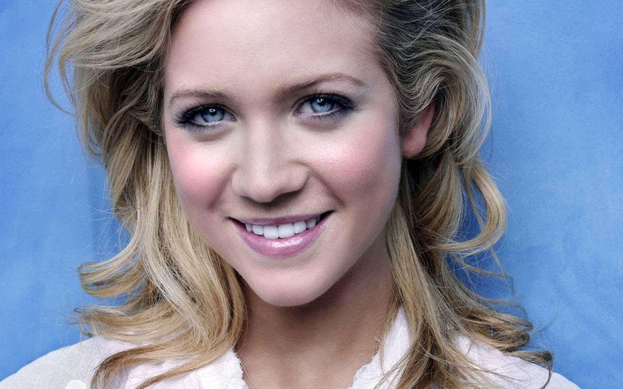 Description: A woman with blonde hair and blue eyes smiling for a picture with a blue background and a blue backdrop.
