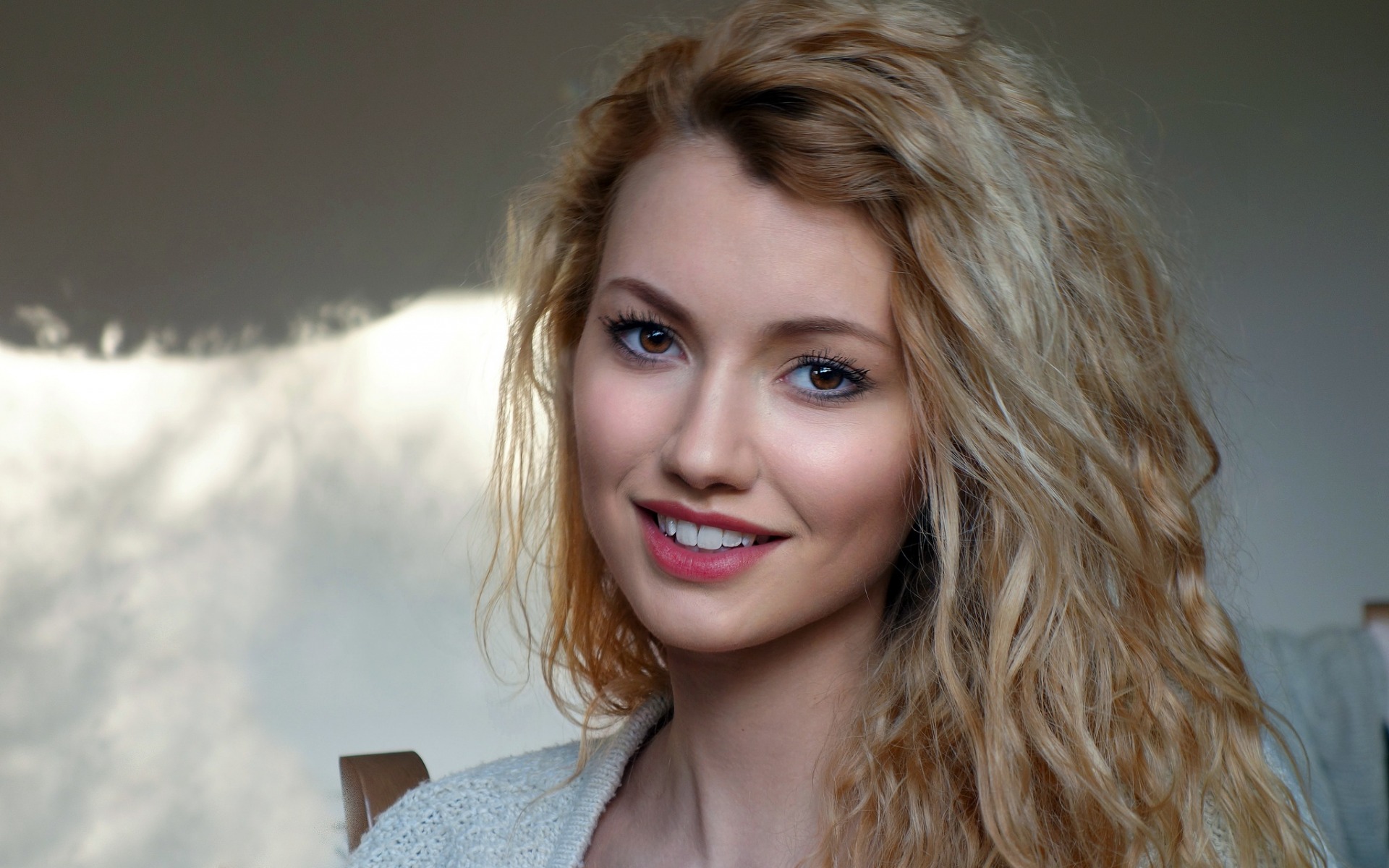 Description: A woman with long blonde hair and blue eyes smiling at the camera with clouds in the background and a soft light.