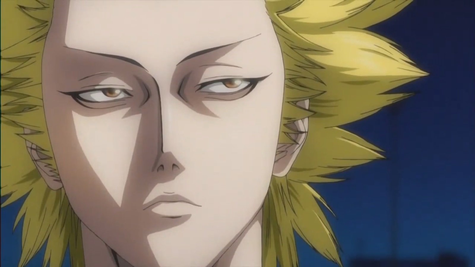 Description: A close up of a person with blonde hair and eyes closed and a blue background with a black frame.