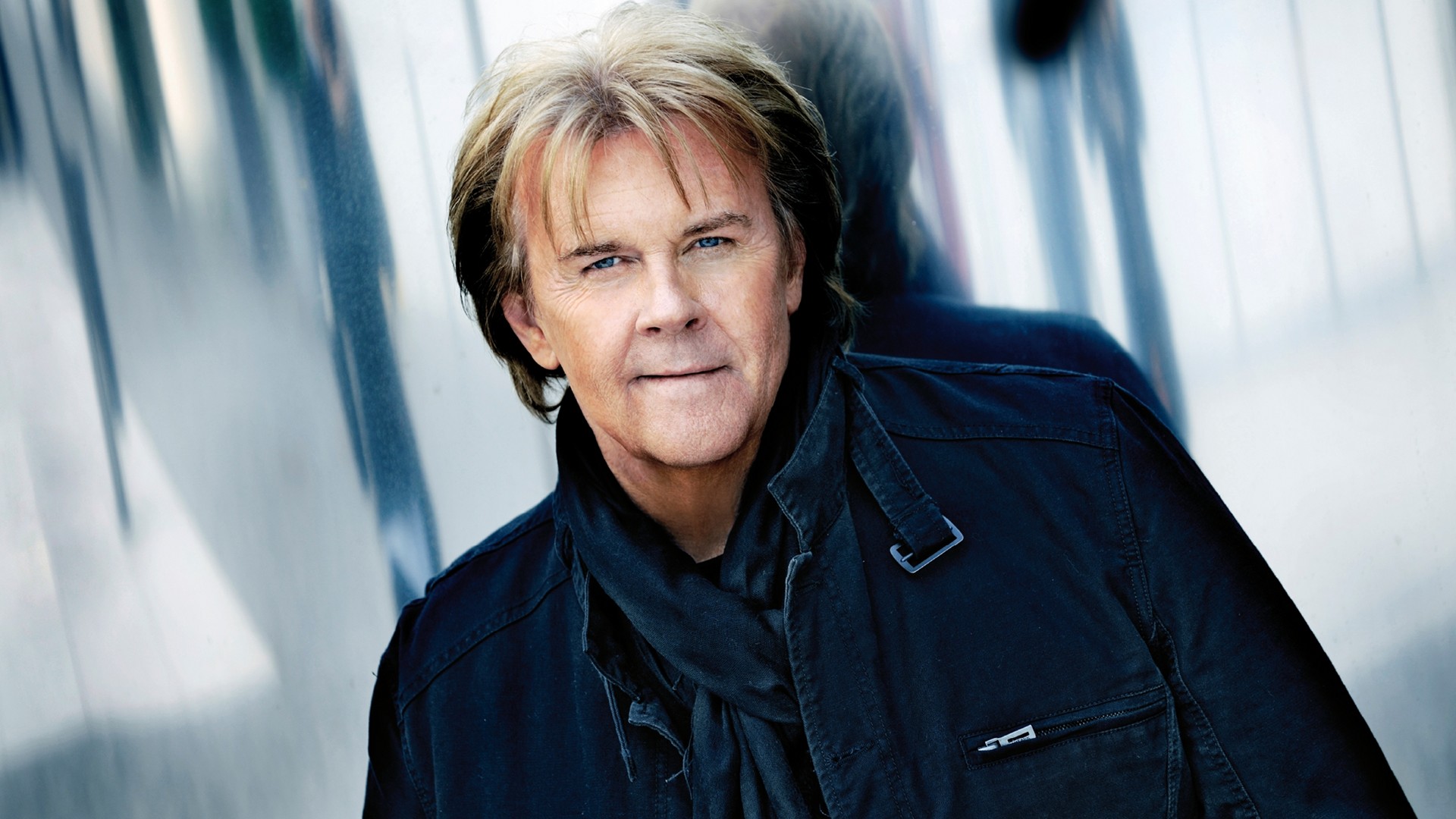 Description: A man with blonde hair and a black jacket is posing for a picture in front of a wall with a reflection.