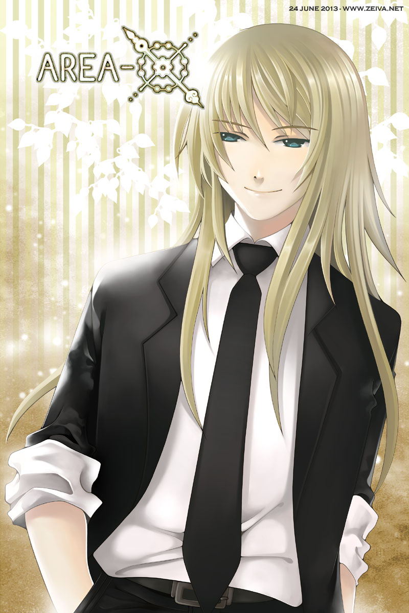 Description: A man in a suit and tie with long blonde hair and blue eyes.