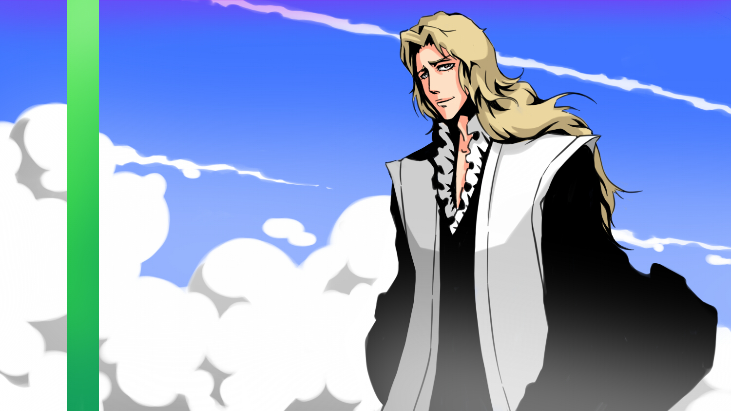 Description: A cartoon of a man with blonde hair and a black and white outfit standing in front of a blue sky.