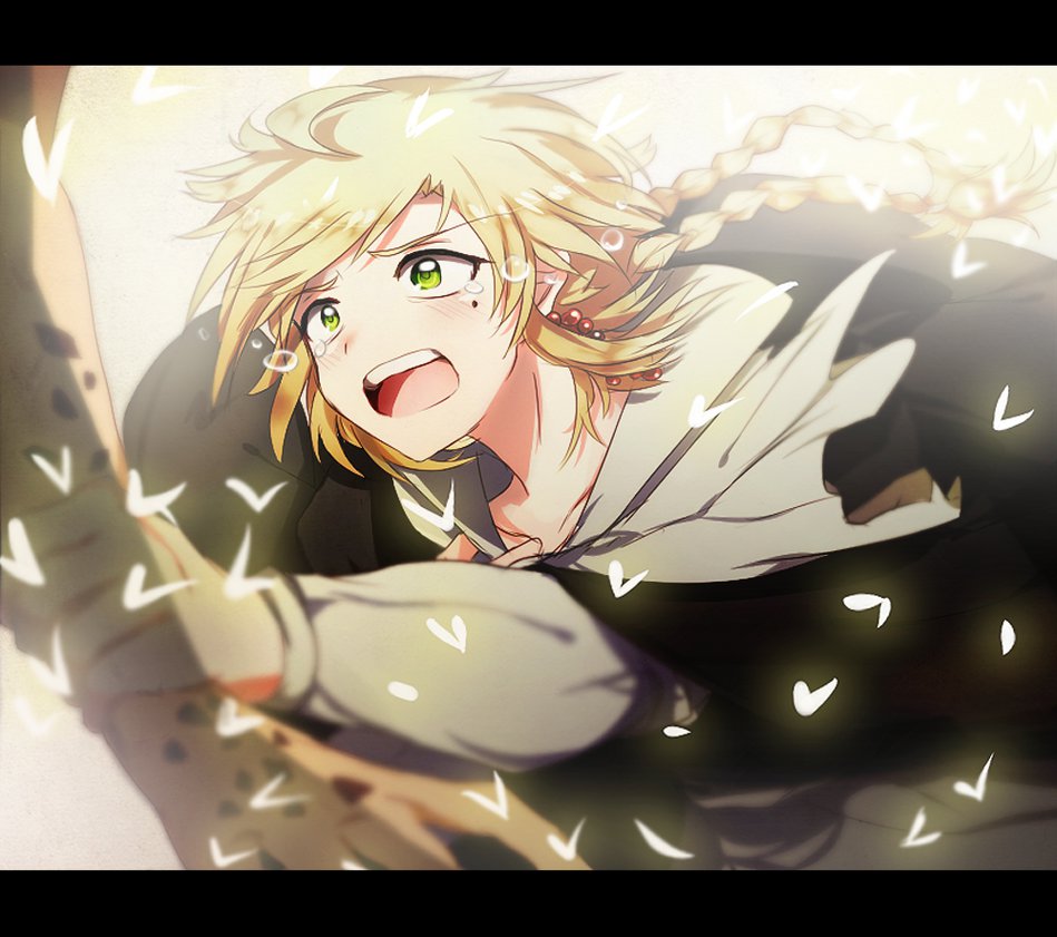 Description: A blonde haired man with a sword in his hand and a white shirt on his chest and a black shirt on his chest.