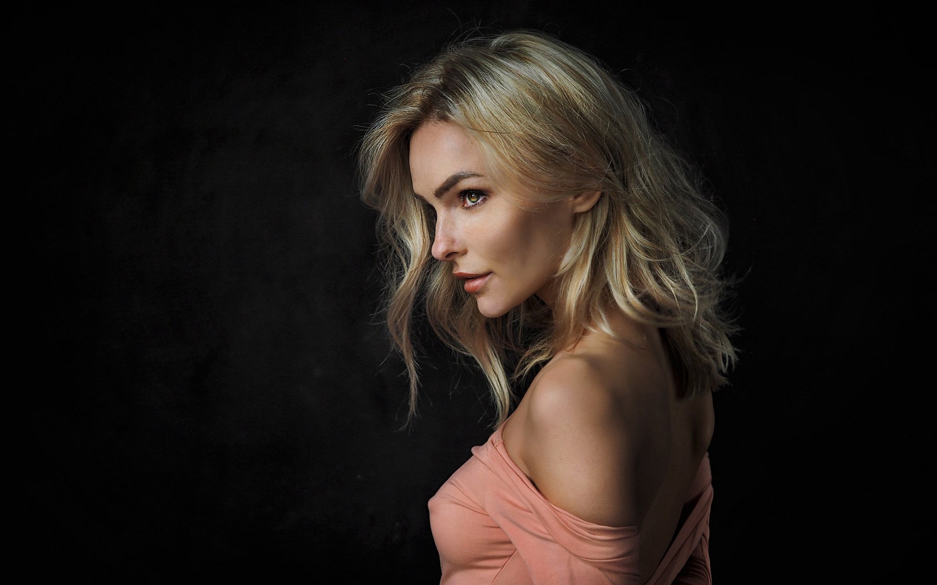 Description: A woman with blonde hair and a pink top posing for a picture in the dark with her eyes closed.