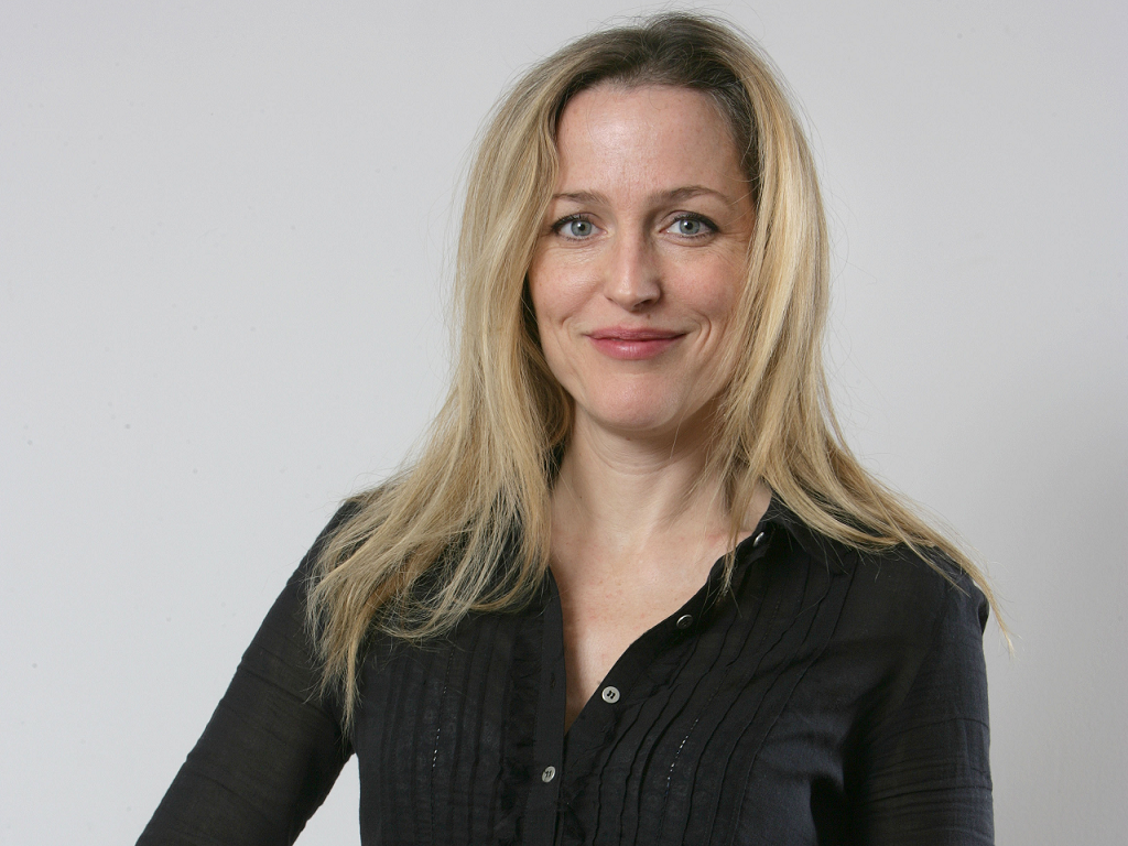 Description: A woman with blonde hair and a black shirt smiling at the camera with a white background and a white wall behind her.