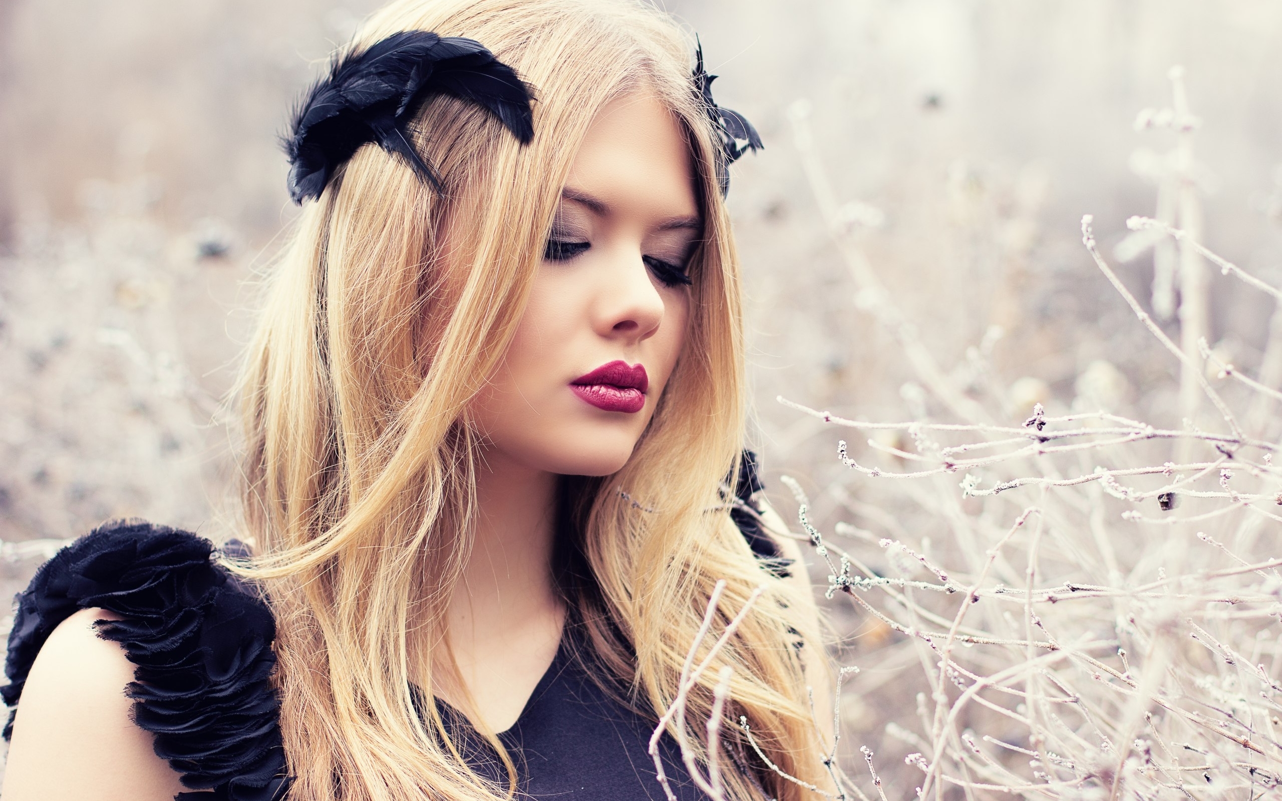 Description: A woman with long blonde hair and a black dress is standing in a field of flowers and grass with her eyes closed.
