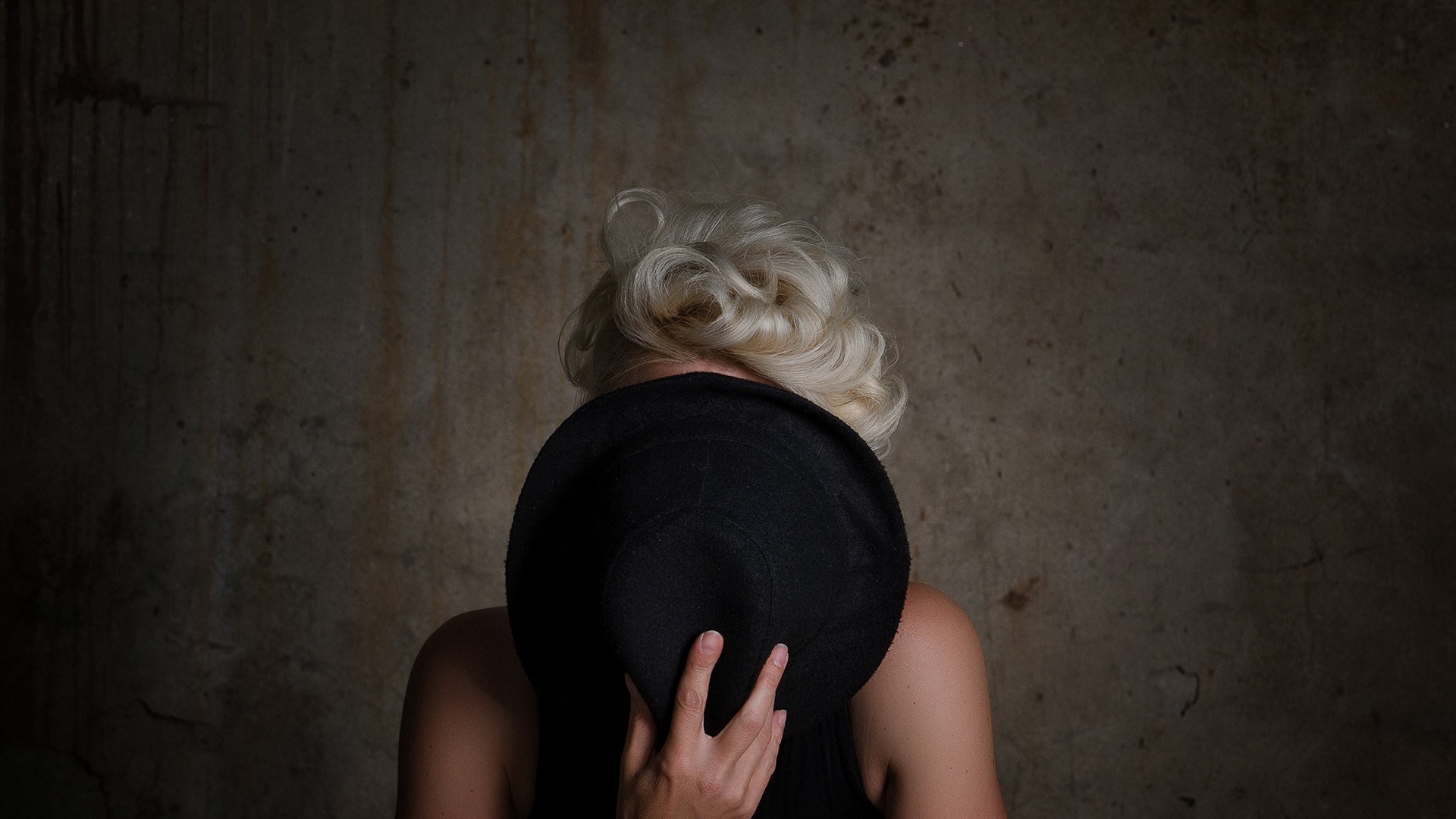 Description: A woman with blonde hair wearing a black hat and a black dress shirt and black hat with white hair.