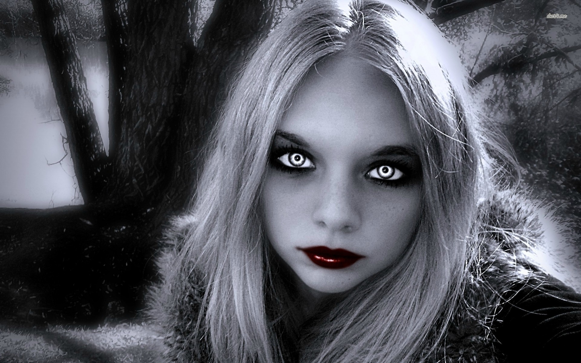 Description: A woman with long blonde hair and black makeup is posing for a picture in front of a tree with red lips.