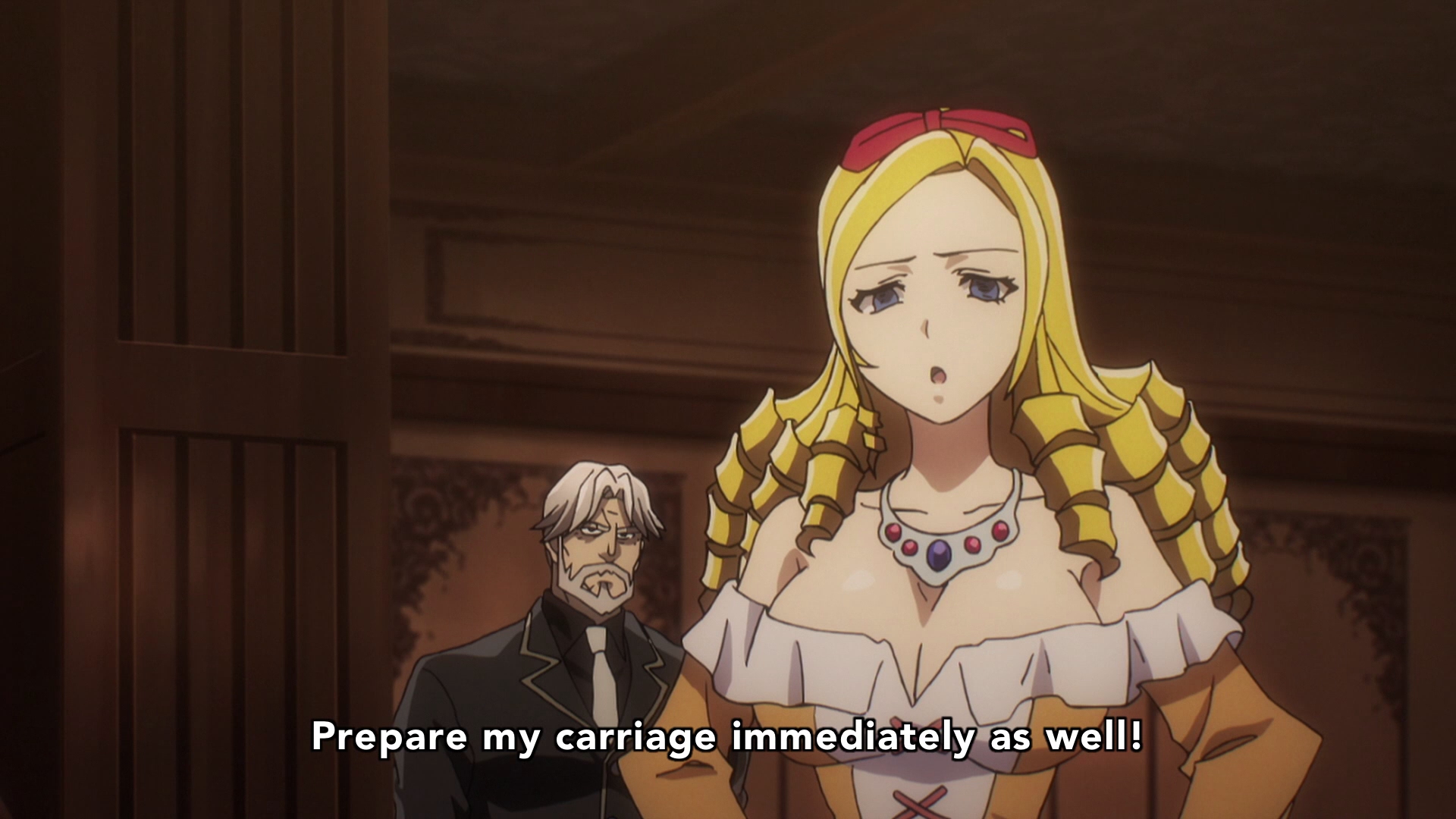 Description: A woman with blonde hair and a man with a black suit in a room with a door and a sign that says prepare my carriage immediately as well.