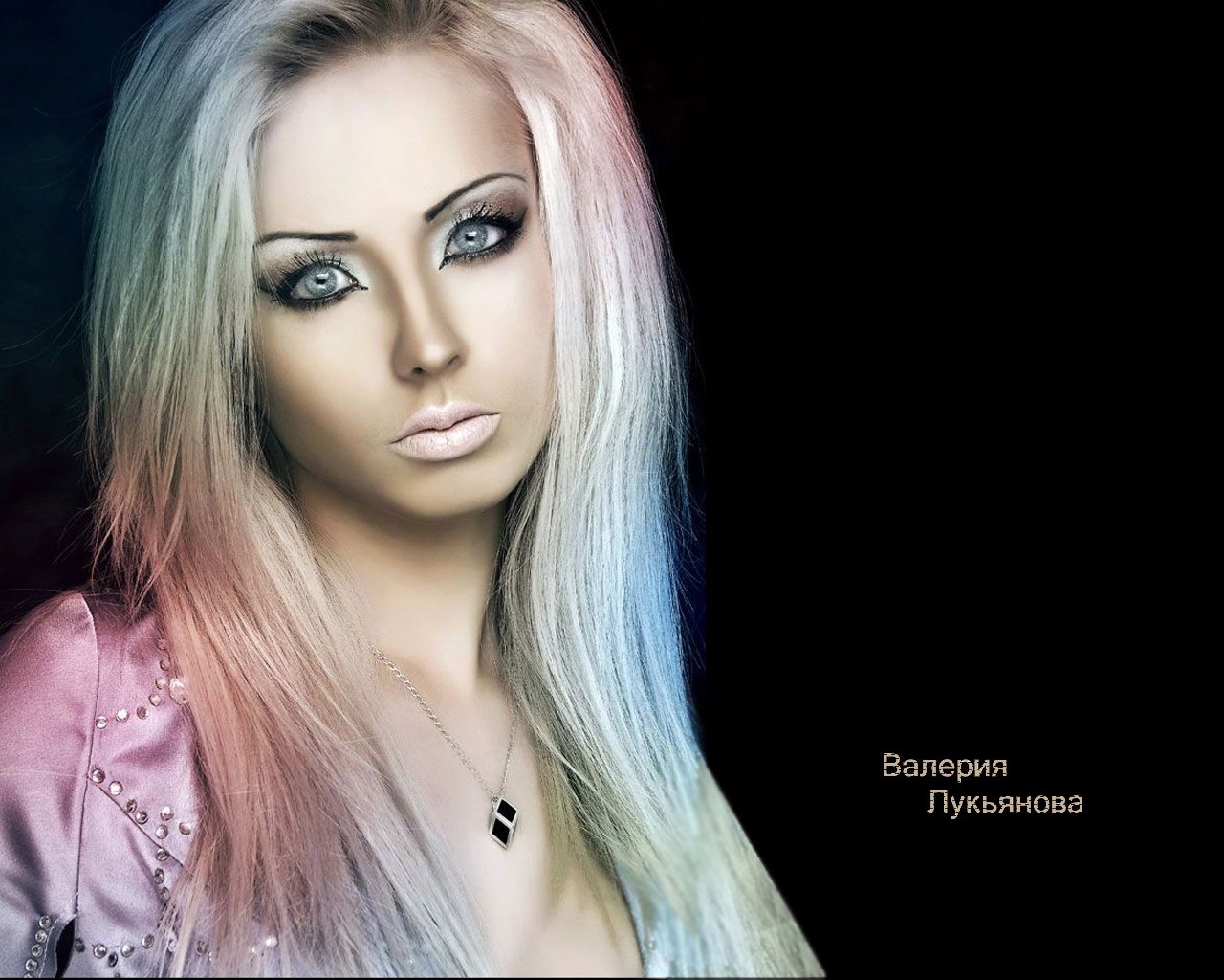 Description: A woman with long blonde hair and blue eyes wearing a pink shirt and necklace with a black background and a black background.