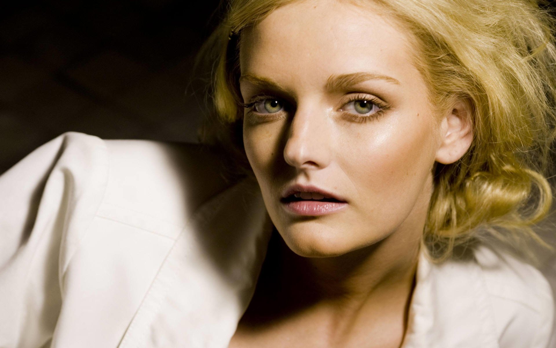 Description: A woman with blonde hair and blue eyes posing for a picture with a white shirt on and a black background.