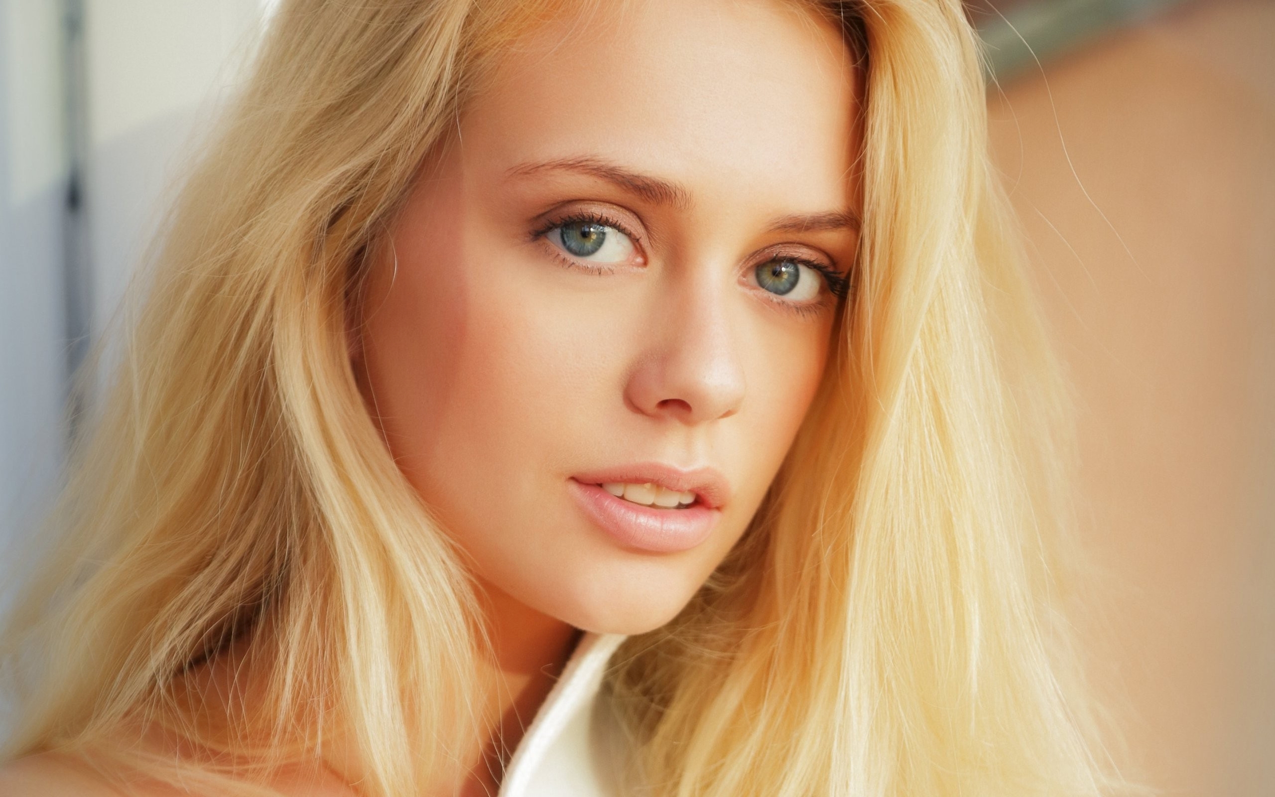 Description: A woman with long blonde hair and blue eyes posing for a picture with a white shirt on and a white shirt on.
