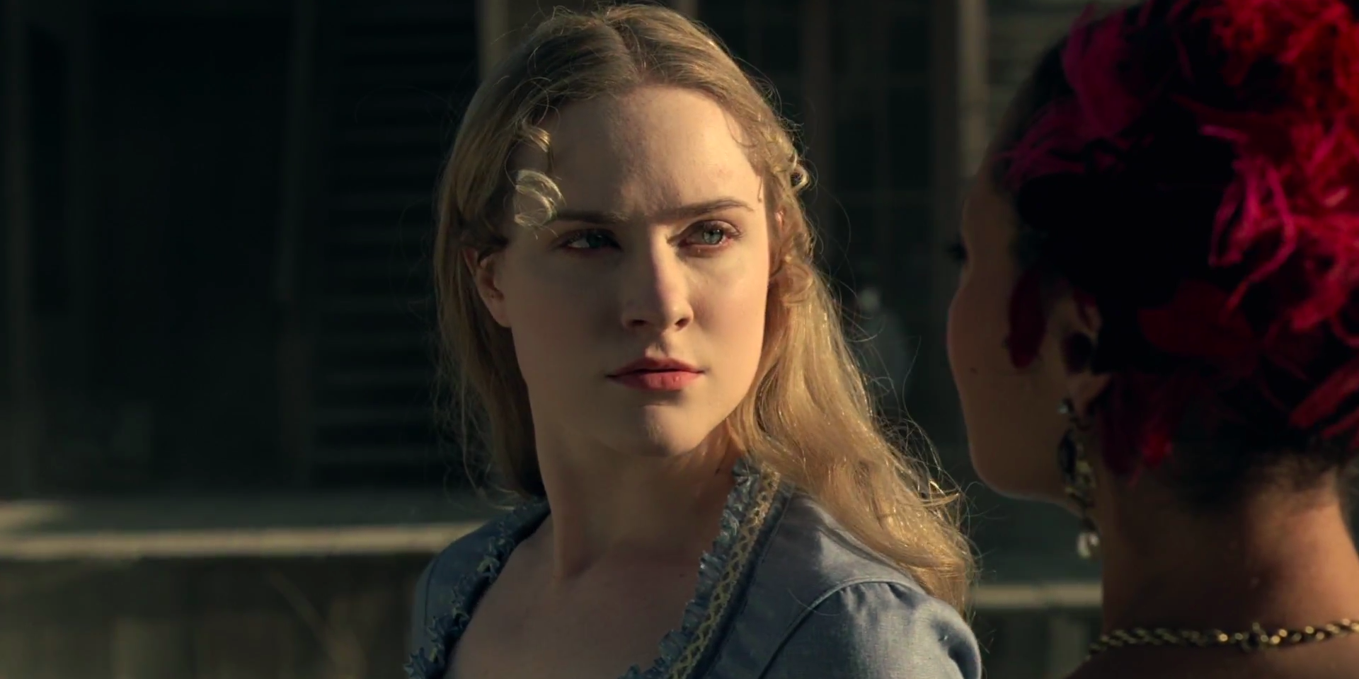 Description: A woman with blonde hair and a blue shirt is talking to another woman in a blue dress and red hair.