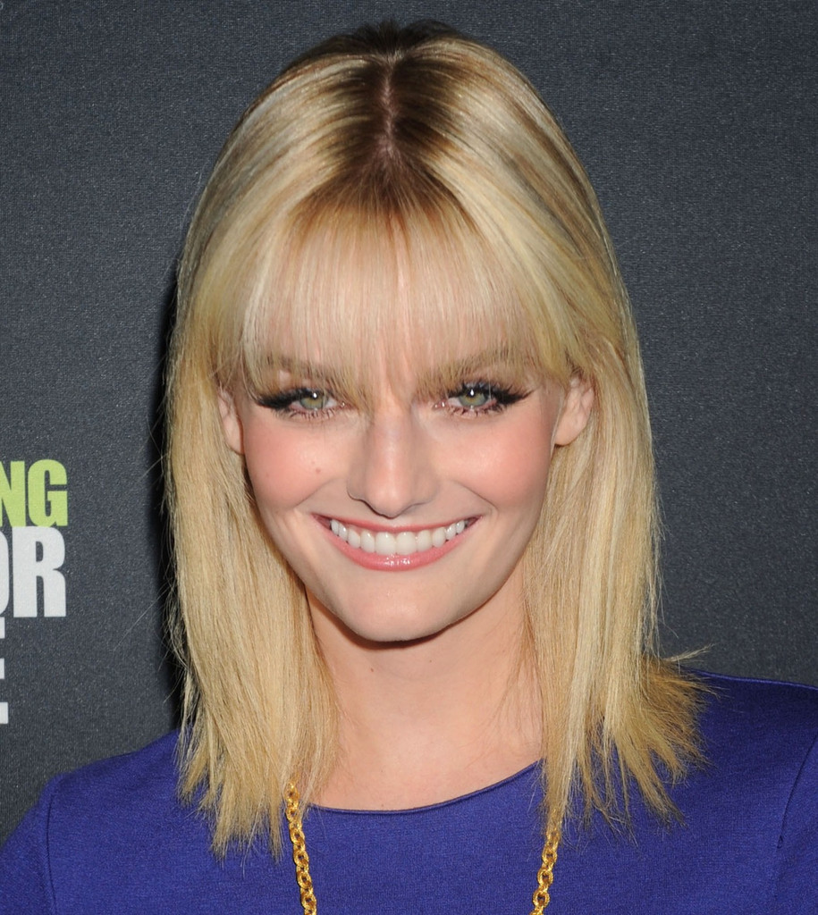 Description: A blonde woman with a blue shirt and a necklace on her neck smiling at the camera with a smiling face.