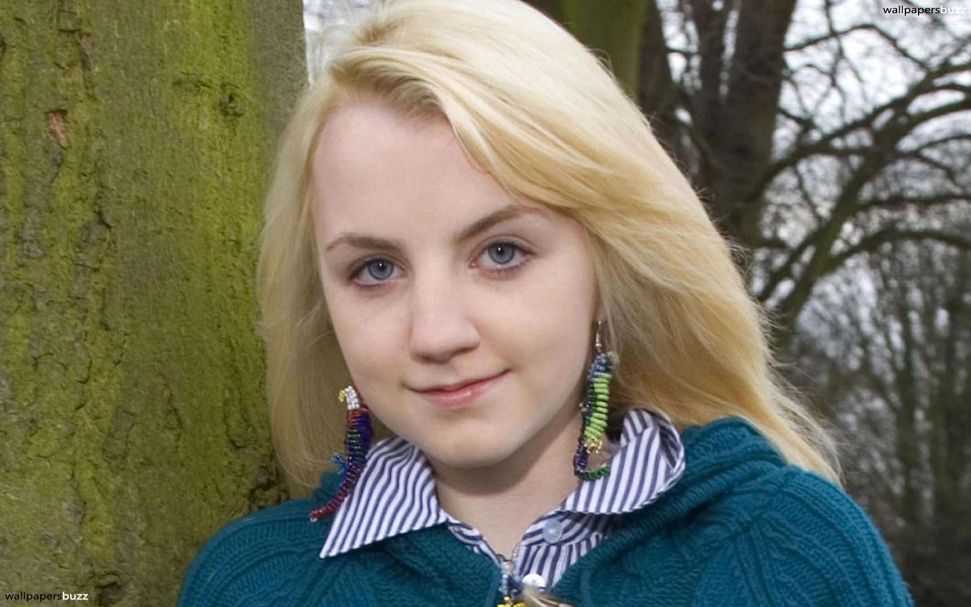 Description: A woman with blonde hair wearing a blue sweater and earrings standing next to a tree in a forest with a green sweater.