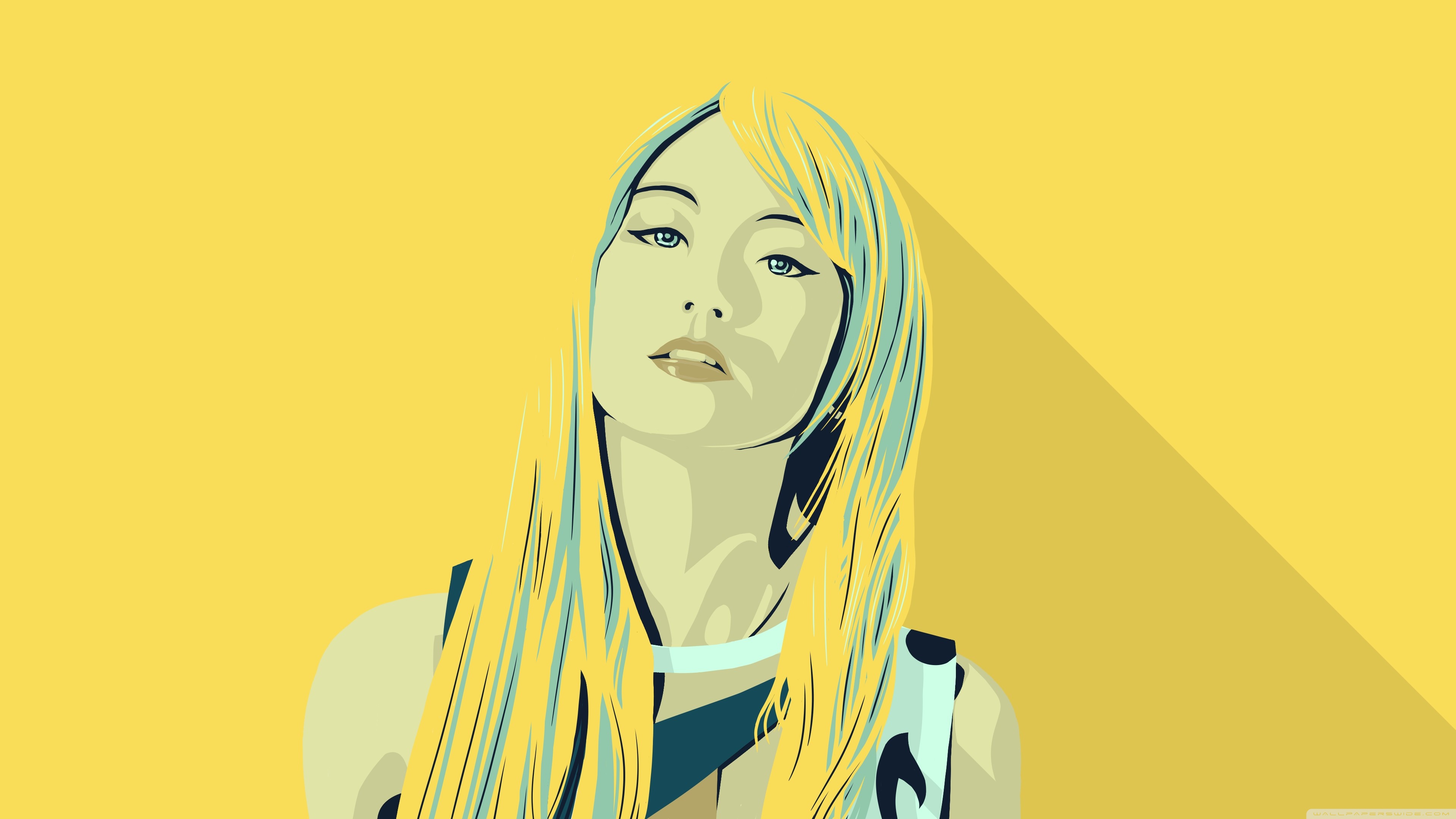 Description: A woman with long blonde hair and a blue top is looking up at the sky with a yellow background.