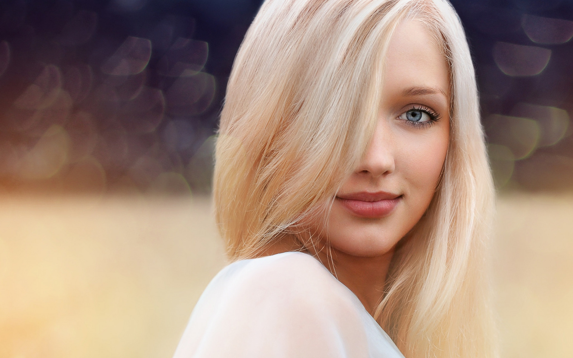 Description: A woman with blonde hair and blue eyes posing for a picture with a blurry background of the image.