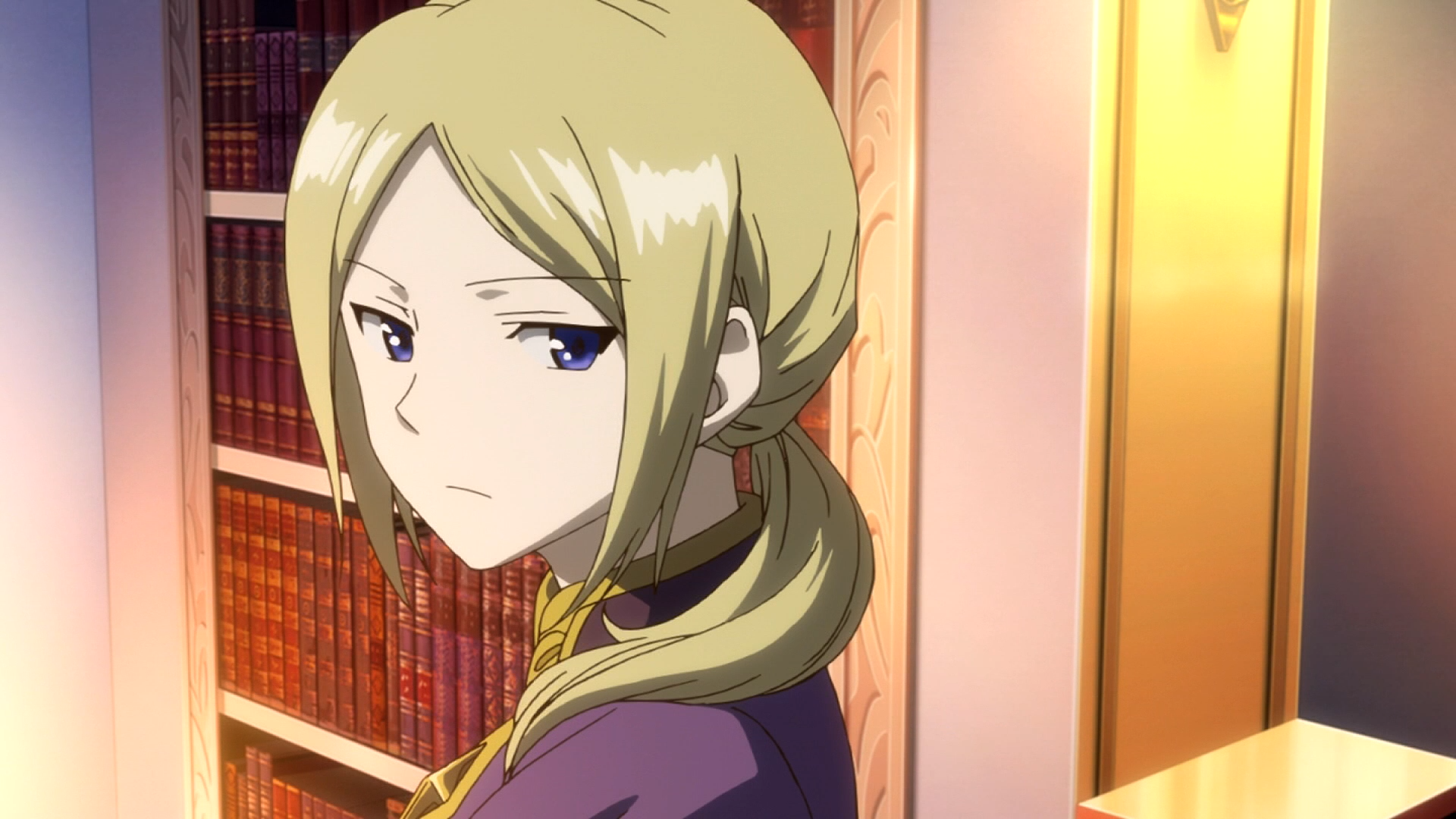 Description: A blonde haired woman standing in front of a book shelf with books on it's shelves and a book case behind her.