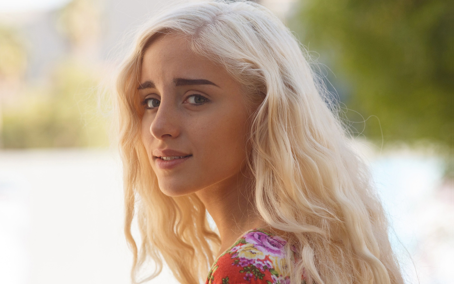 Description: A blonde woman with long hair and a flowered shirt is looking at the camera with a serious look on her face.