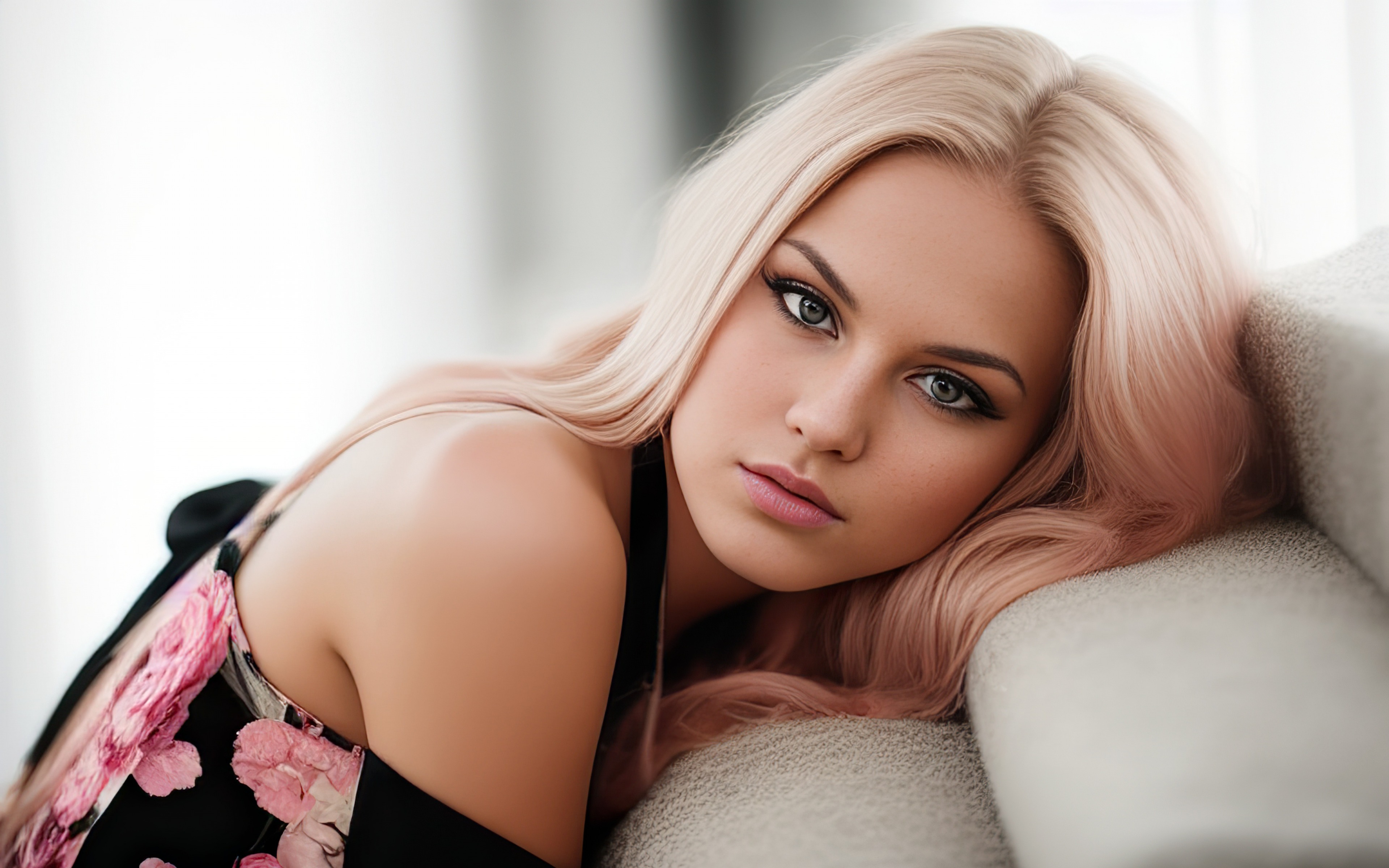 Description: A woman with blonde hair laying on a couch with her hand on her head and her eyes closed.