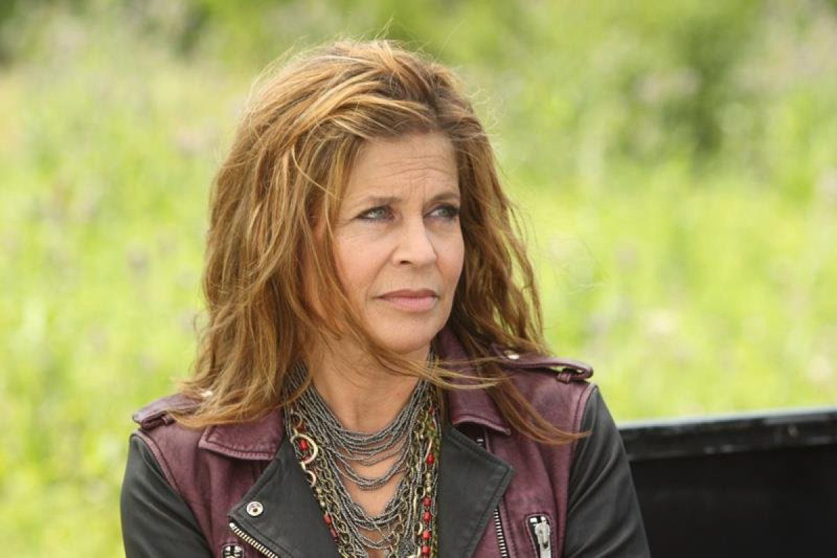 Description: A woman with a leather jacket and necklaces on sitting in a chair outside in the grass with a green background.