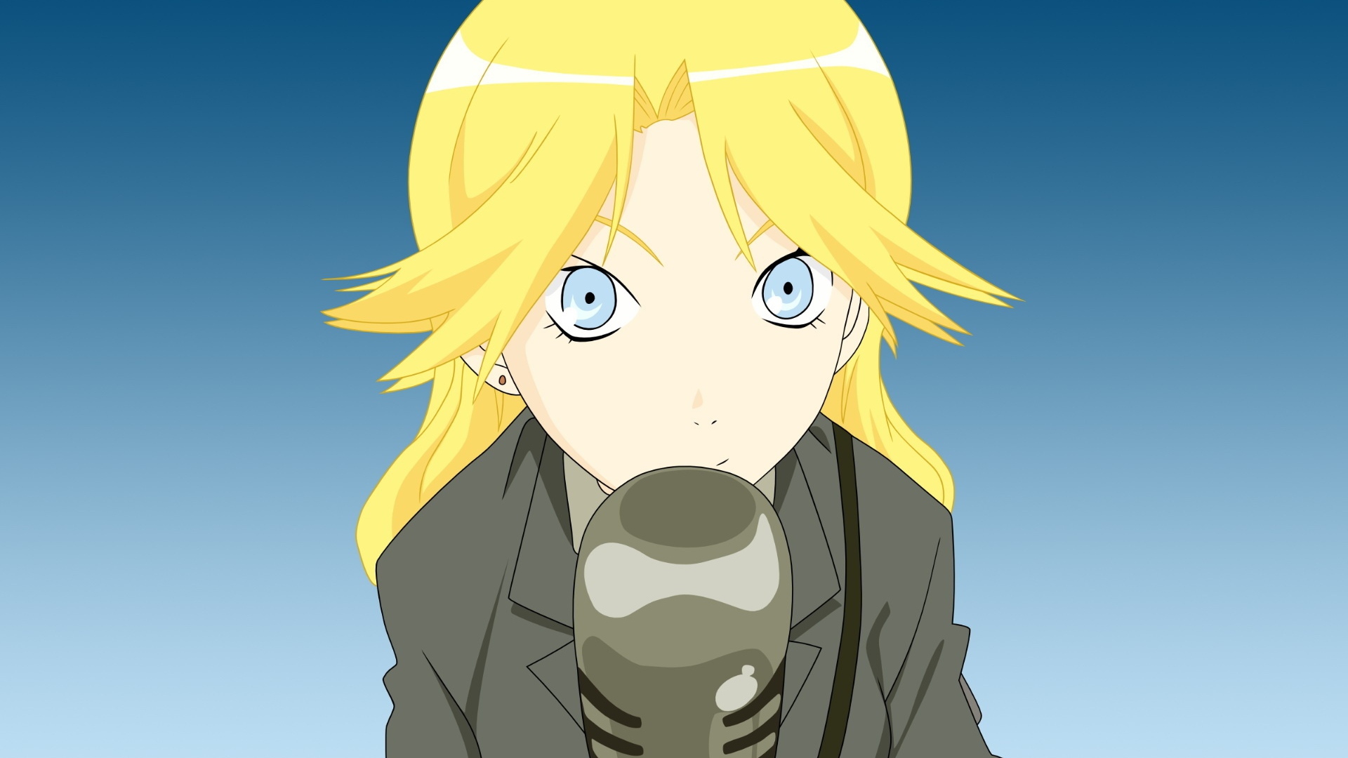 Description: A blonde haired woman with a microphone in front of a blue sky background with a microphone in front of her.