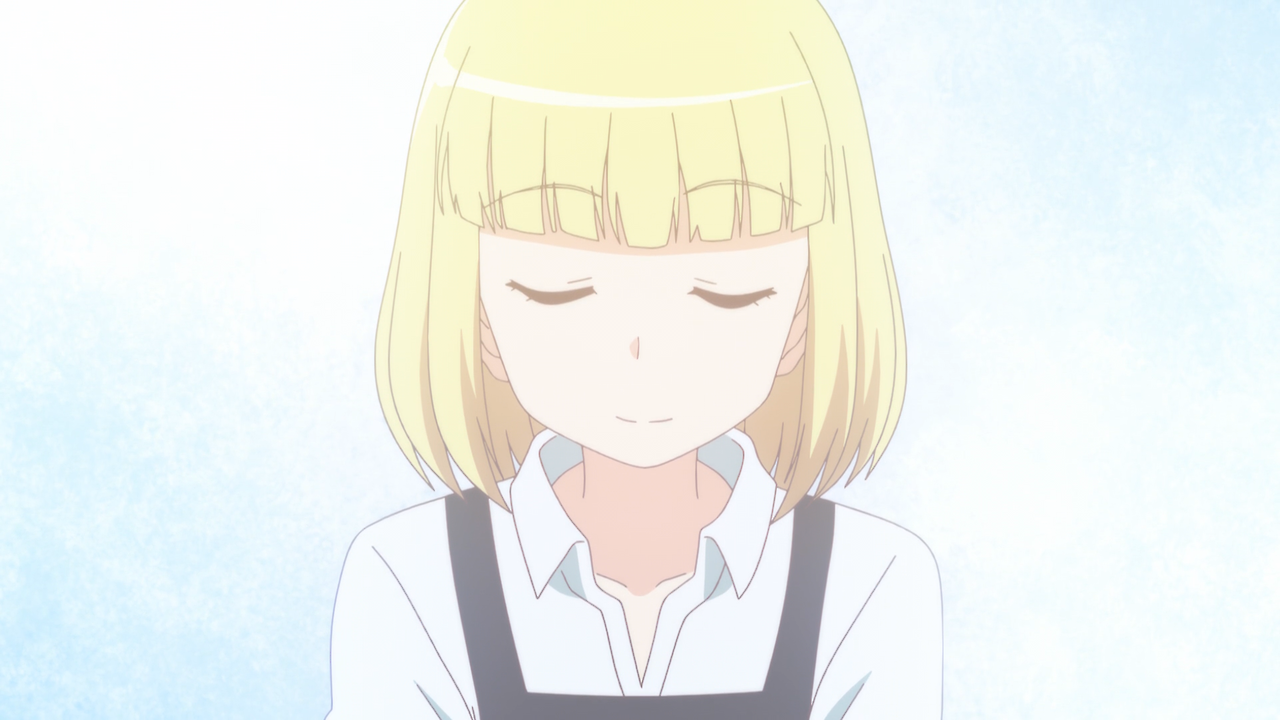 Description: A woman with blonde hair and a white shirt is staring at something with her eyes closed and her head tilted.