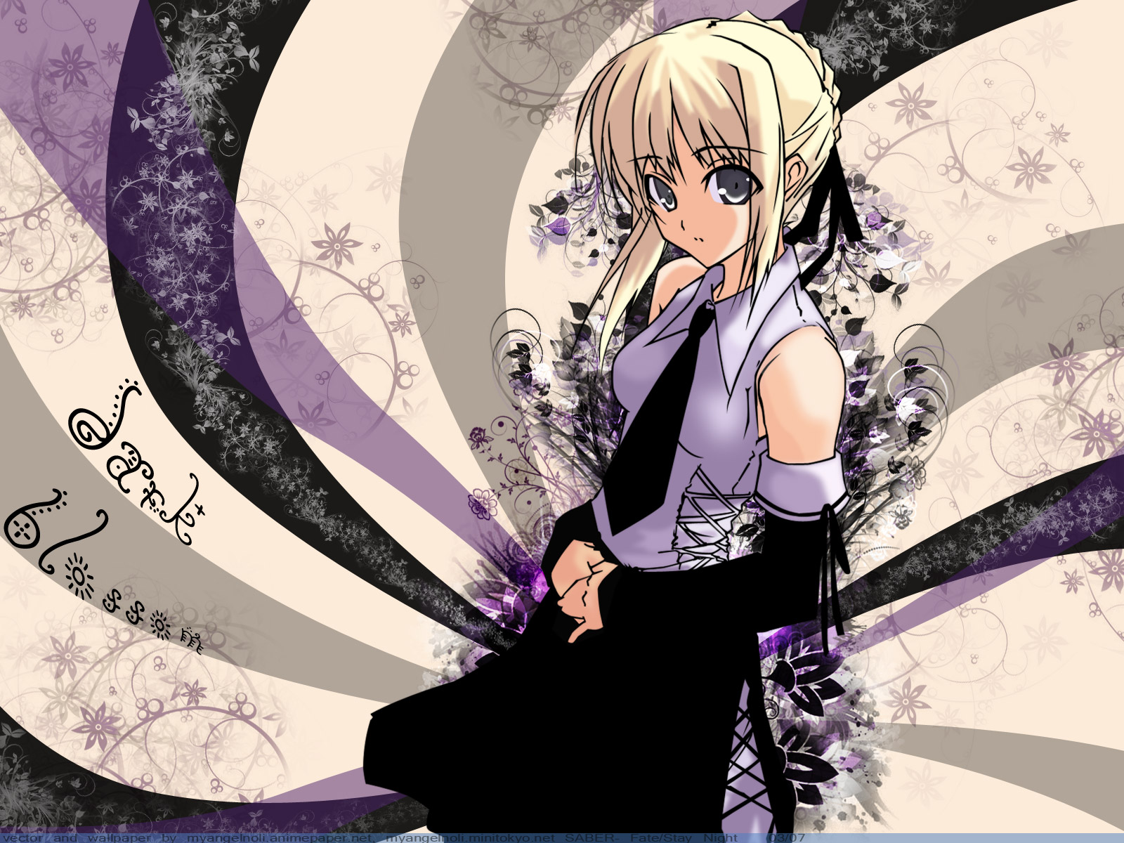 Description: A woman with blonde hair and a purple dress is standing in front of a purple and white background with flowers.