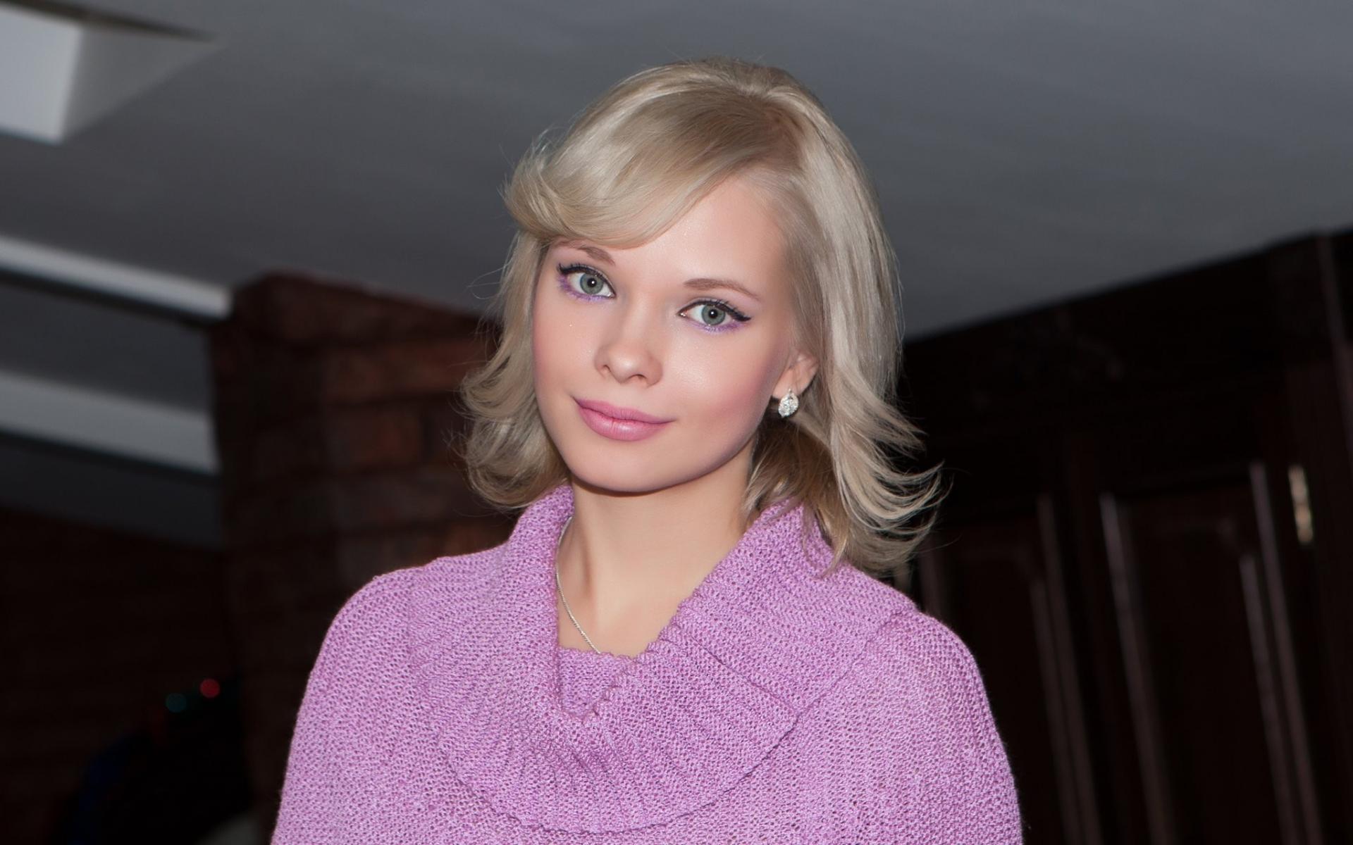 Description: A woman with blonde hair wearing a purple sweater and earrings.