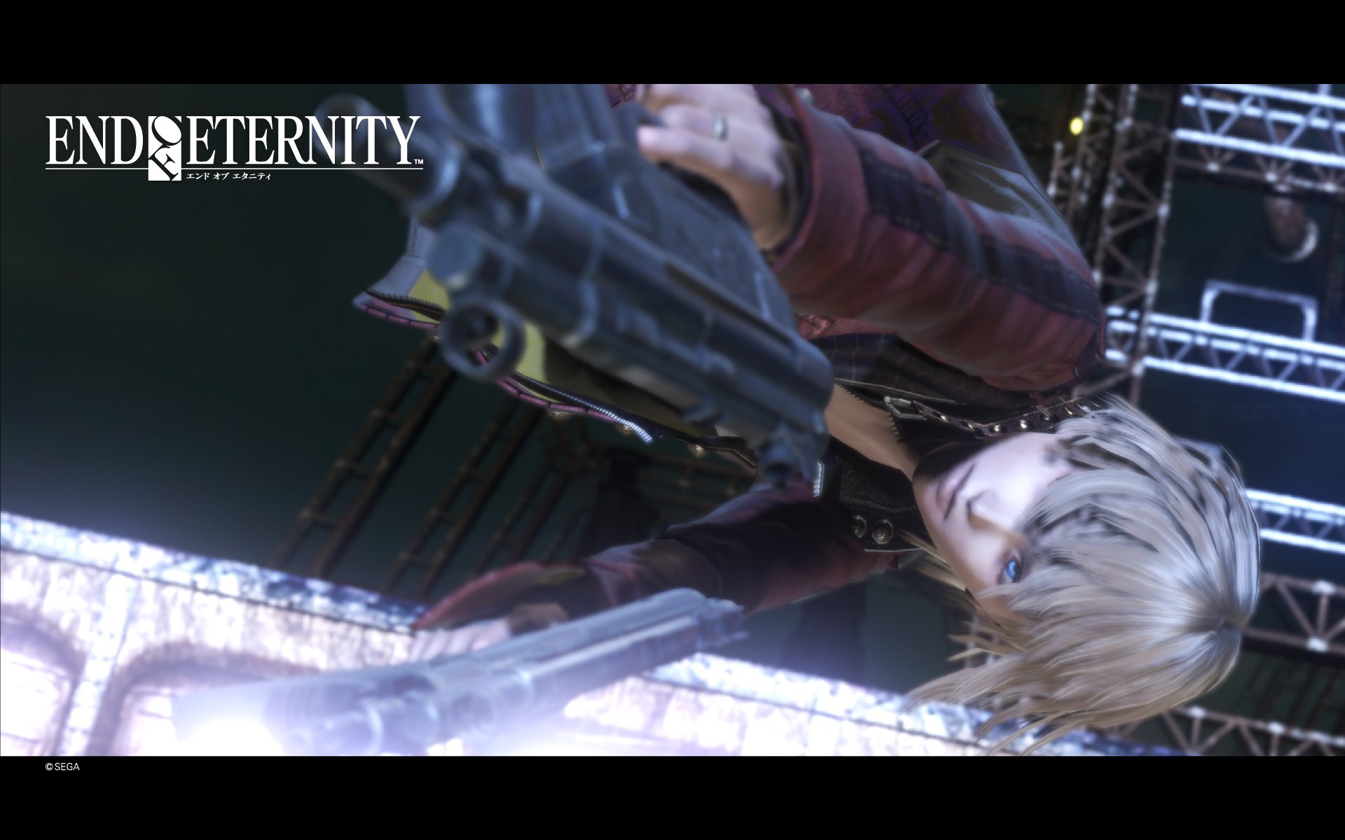 Description: A woman with blonde hair and a red jacket is holding a gun in front of a stage with a crowd.