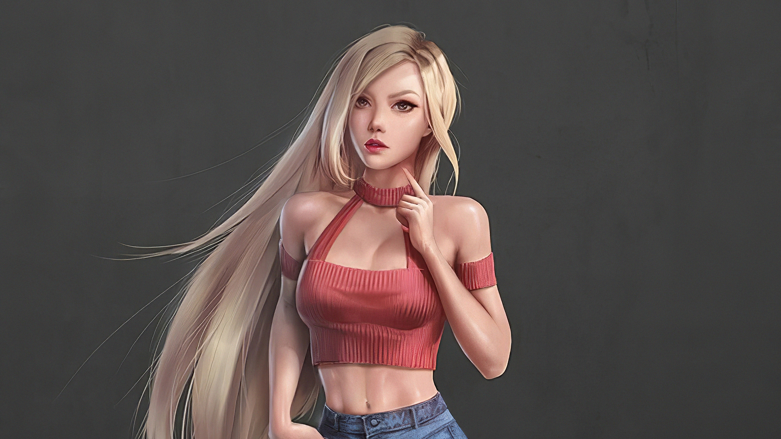 Description: A woman with long blonde hair wearing a red top and jeans.