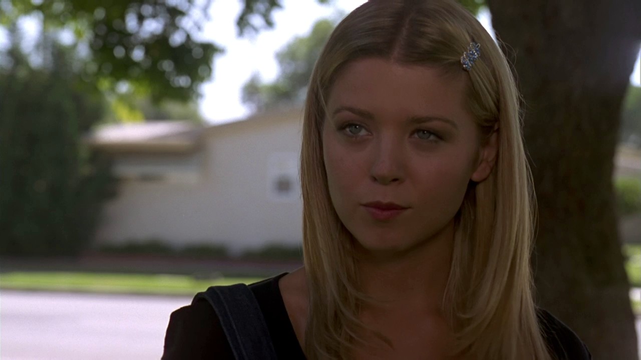 Description: A woman with blonde hair standing in front of a tree and a house in the background with a house in the background.