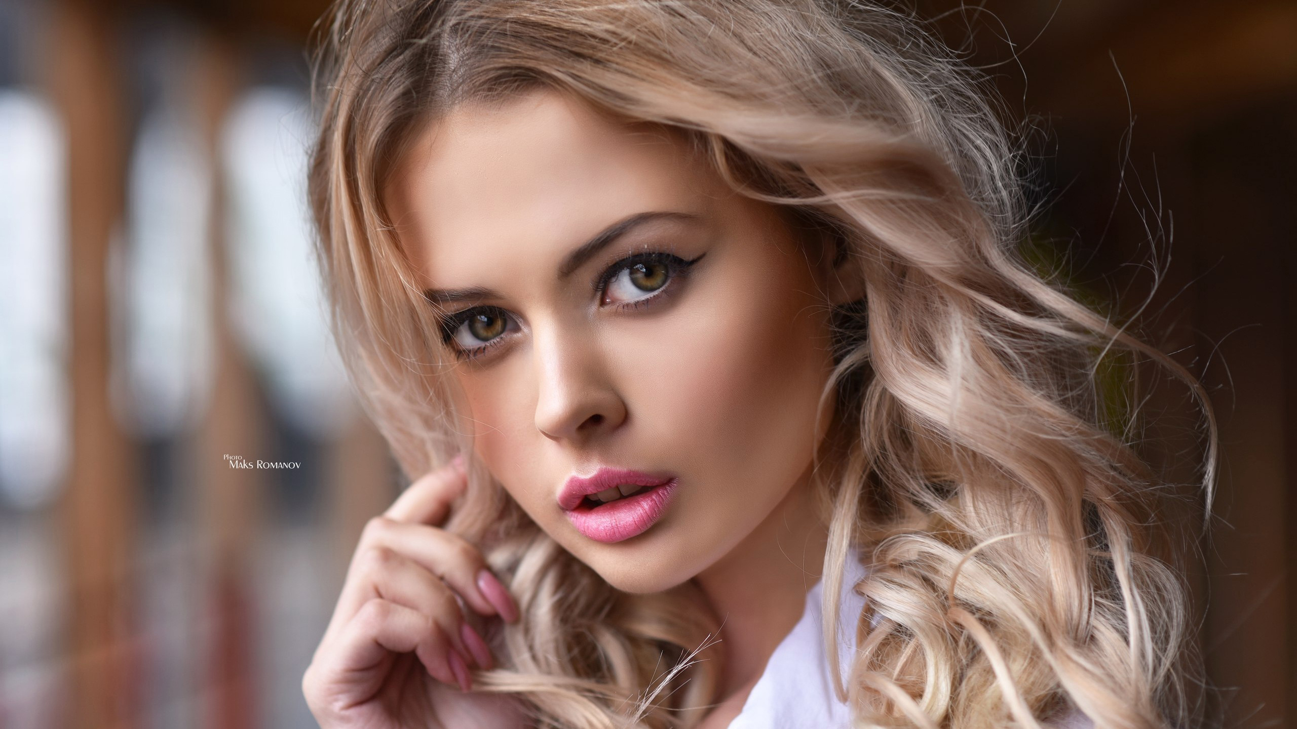 Description: A woman with long blonde hair and a white shirt is posing for a picture with her hand on her cheek.