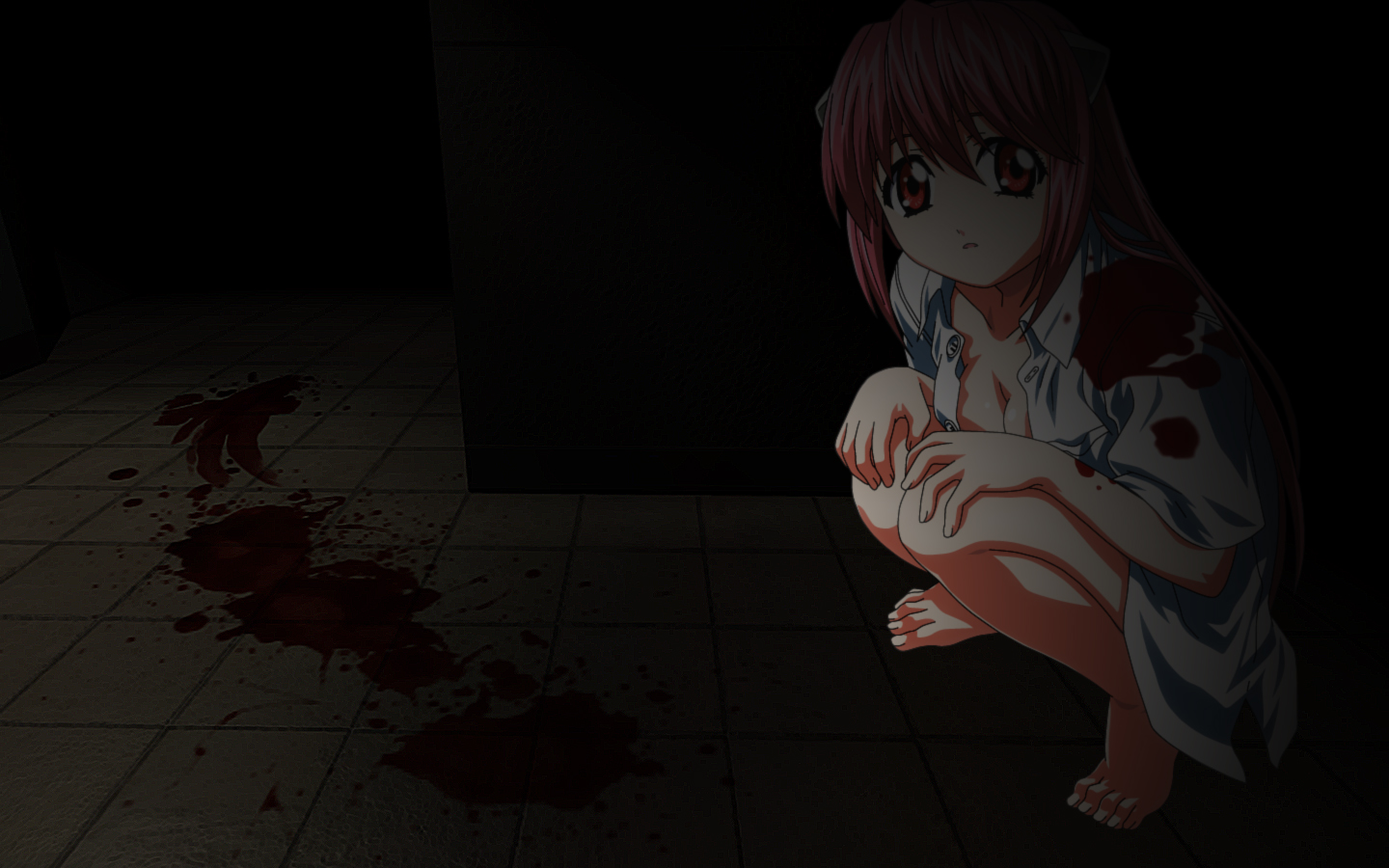 Description: A girl sitting on the floor with blood all over her body and knees.